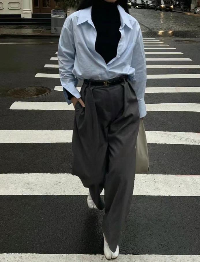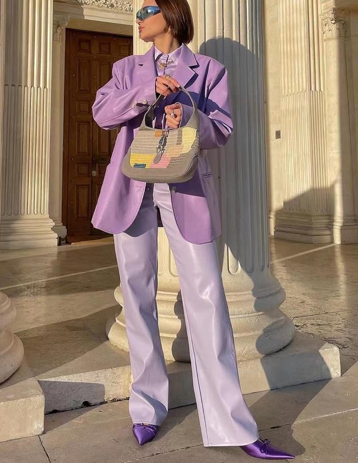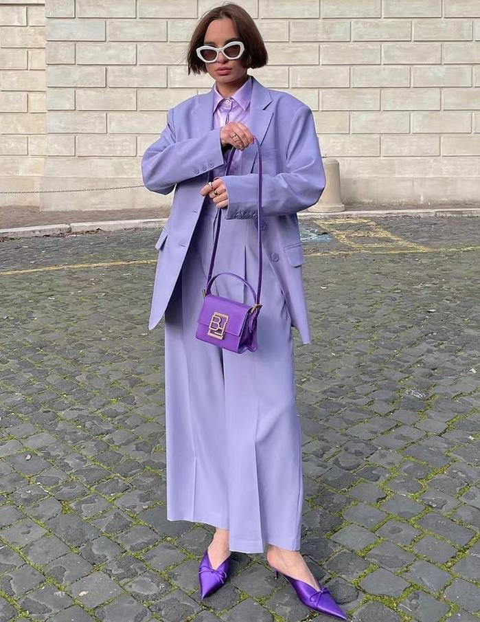 適合上班通勤,又可以在日常逛街穿的一套,淡紫霧色西裝外套+闊腿褲,真的很顯氣質顯瘦。