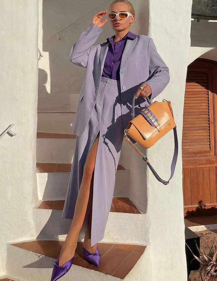 好喜歡這種淡紫霧色,真的很適合亞洲人的膚色,西裝外套+開叉半身長裙,裙襬開叉的設計,很好將腿部線條給拉長了。