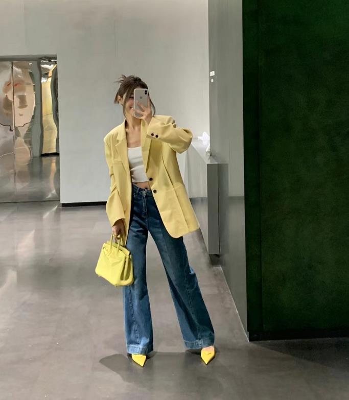 到了早春,就是要穿點彩色啊,檸檬糖黃今年有些流行,黃色的西裝外套+牛仔褲,牛仔單品的加入,不管是什麼難以駕馭的顏色,都可以得到平衡。