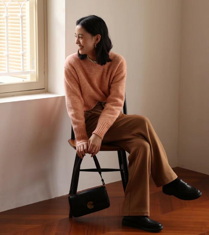巨顯白的柔和桃色毛衣,這個顏色實在是太讓人心動了,奶fufu的色調就是很顯白。搭配基礎簡約的款式,怎麼搭配都可以。