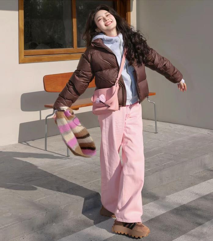 柔和桃色的褲子+棕色羽絨服,這樣的配色也太美了吧?上短下長的組合,很好優化了身材比例,打造出高挑感。