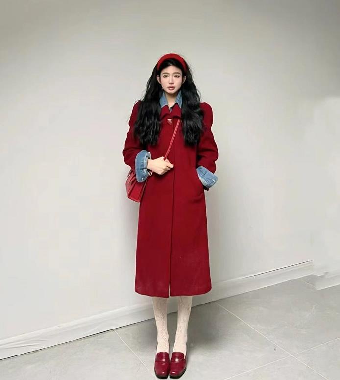 自古紅色出cp,撞色的穿搭總是自帶亮眼和復古的,國寶茶紅色外套,內搭混搭了牛仔襯衫,把領子和袖子稍微露出來一些,營造出層次感。