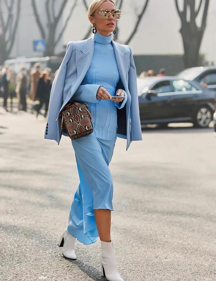 這一身藍色系的穿搭,看起來真的非常溫柔乾淨啊,藍色西裝+打底裙,裙襬有些不規則的設計,可顯個性與氣質了。