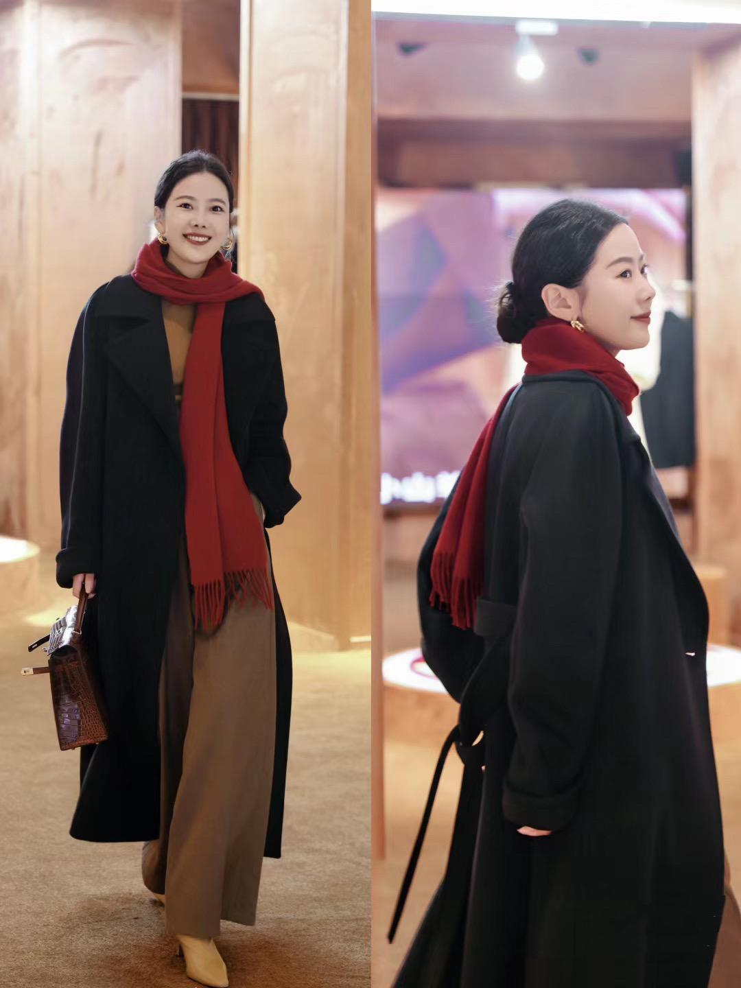 經典的紅色圍巾,可以選擇一種溫柔耐看的棗紅色。亮度沒有那麼高的棗紅色,更是透着溫柔嫺靜的美,配黑色大衣來穿着、特別日常也隨和溫柔。
