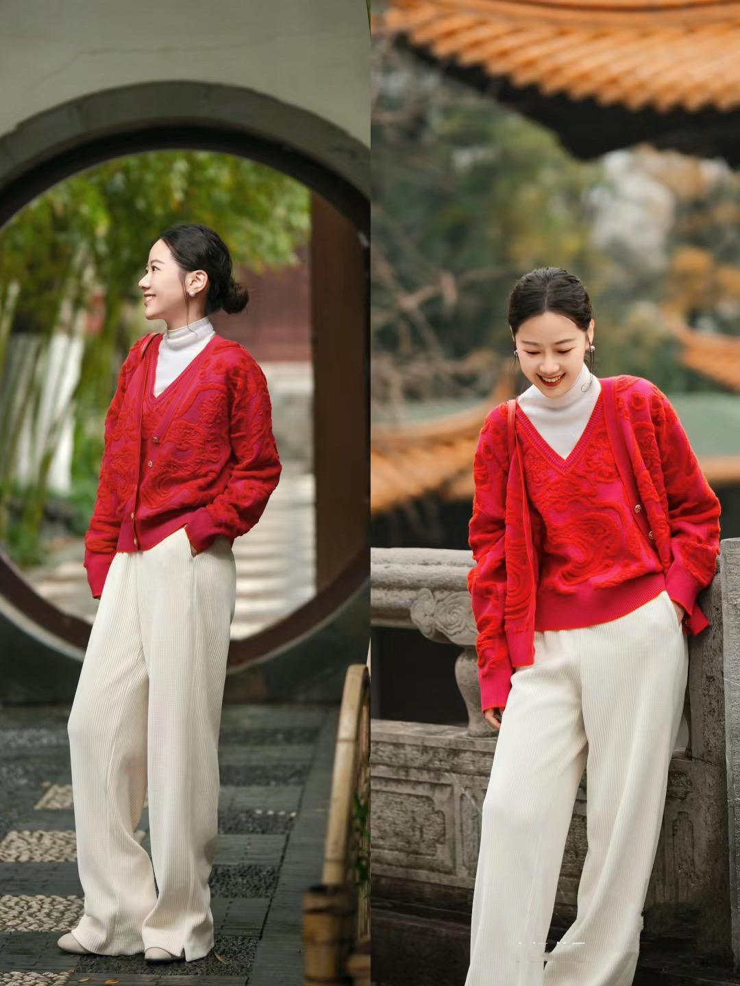 如果覺得紅色V領毛衣直接單穿有一點乏味,我們可以疊搭半高領的打底衫。半高領打底衫配上V領的紅色毛衣,層次清晰又保暖,搭配高腰的闊腿褲、隨性溫柔。
