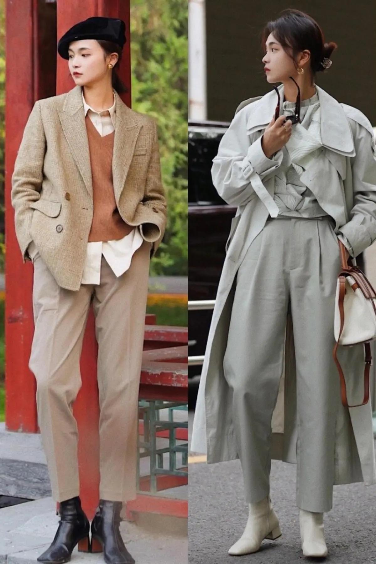 比如九分的高腰西褲,搭一雙瘦瘦靴,寬鬆有度的對比顯得腳踝纖細。剛剛到腳踝位置的靴筒,配上利落的九分褲,特別的幹練大方,高腰線塑造出大長腿更加惹眼。
