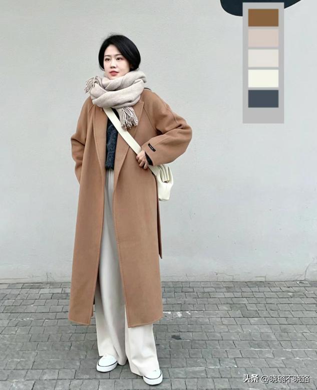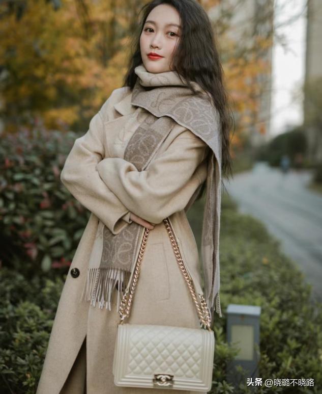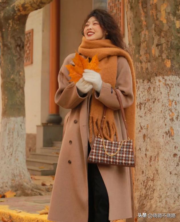 呢大衣和圍巾的顏色也有協調好,避免花裏胡哨的,顯得太臃腫邋遢了,最簡單的搭配就是同色系組合,圍巾搭配什麼顏色,直接看呢大衣就好,杏色呢大衣穿起來溫柔知性,非常的有氣質,如果搭配顏色太豔麗的藍色或者綠色的圍巾,難免有些扎眼,所以爲了整體的風格,還是戴一條杏色的圍巾更好,注意靠近臉部的圍巾,儘量以暖白色爲主,飽和度低一些,上身效果更好。