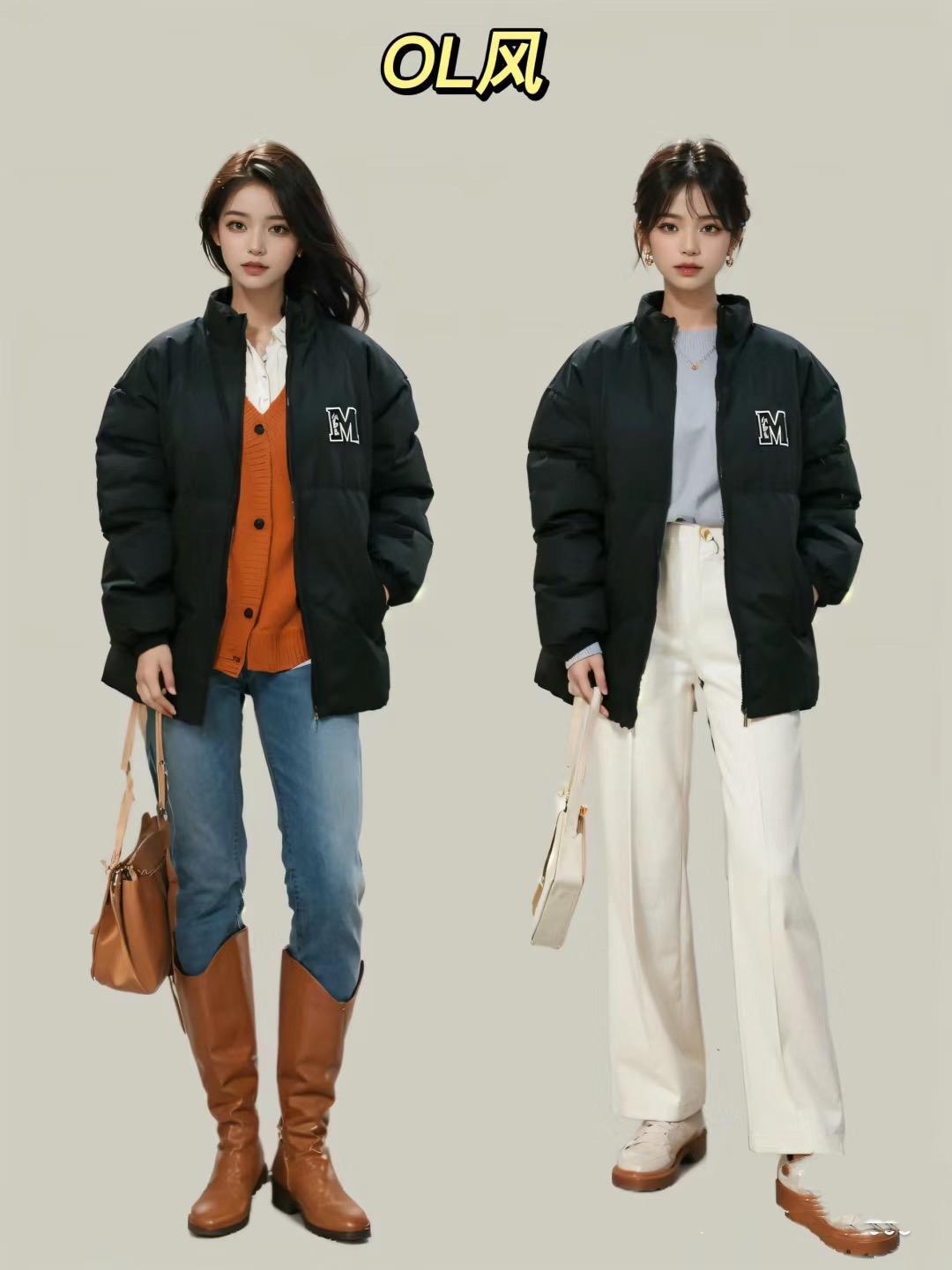 搭配的意義,在於發現更多的可能,塑造出多重風格。一件黑色棉服,可塑性也是蠻強的。OL風的穿搭,給人一種體面又精緻的美。