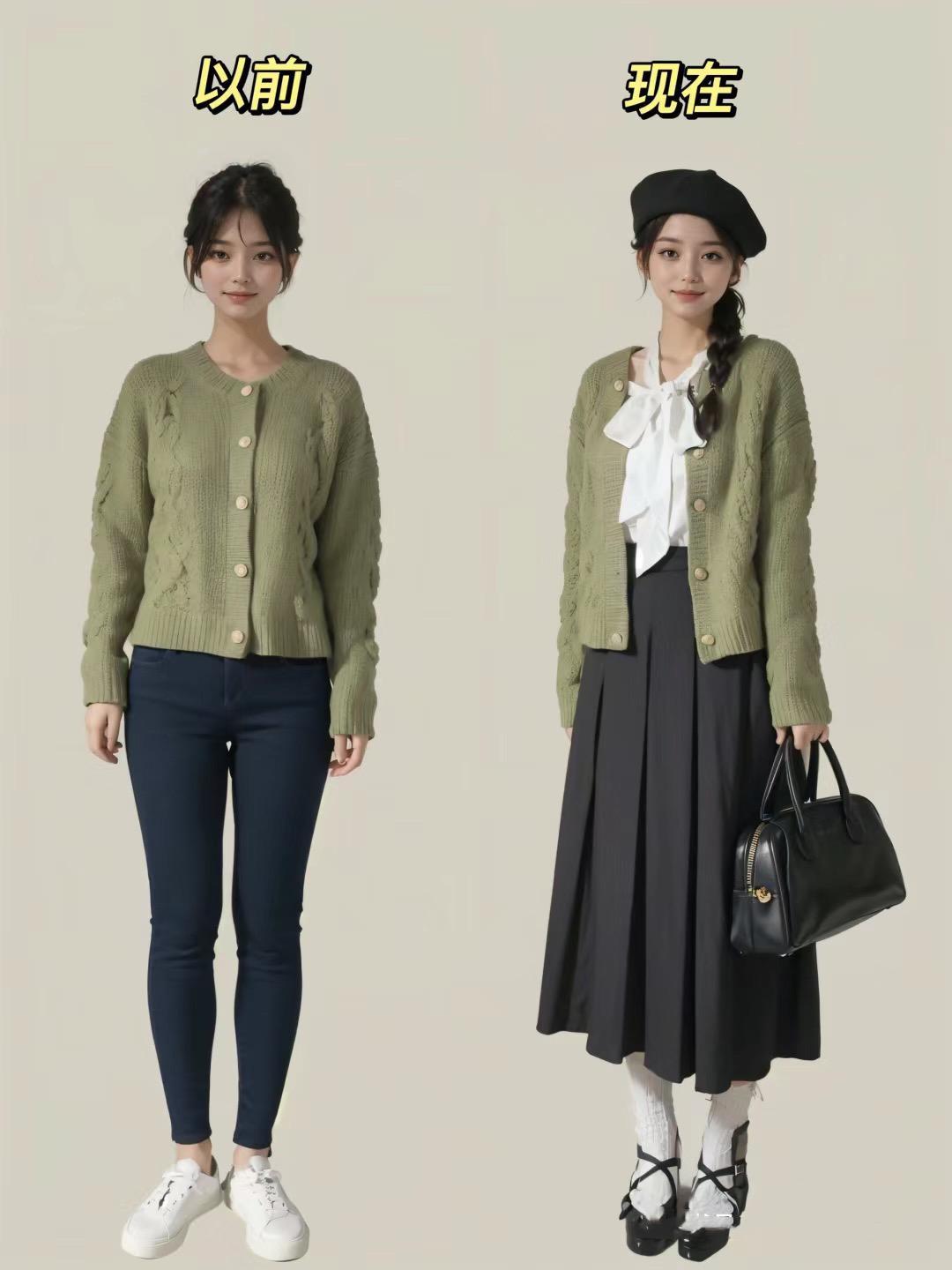 復古風的針織開衫,獼猴桃綠的顏色,清新又甜美。但以前的時候,用來搭配緊身的小黑褲,真的是毫無時尚感可言。