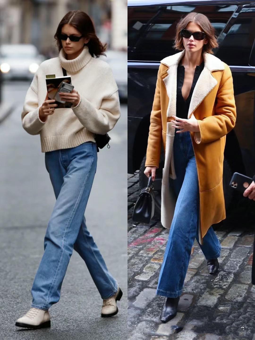 像這種撞色的大衣外套,搭配了修身的直筒牛仔褲,可以顯得雙腿筆直挺拔。如果腿型有一點粗壯,我們也可以選擇闊腿的直筒牛仔褲,可以顯得雙腿挺拔高挑。