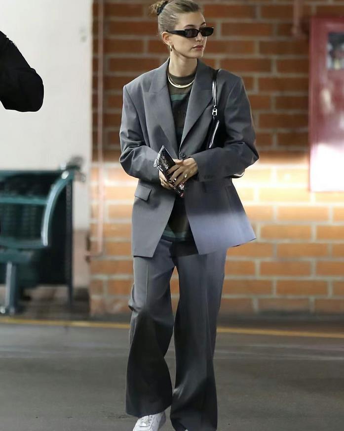 灰色西裝外套+西裝闊腿褲,同系列的組合,對於懶人來說,那可是很不錯的選擇,出門也省時了許多。