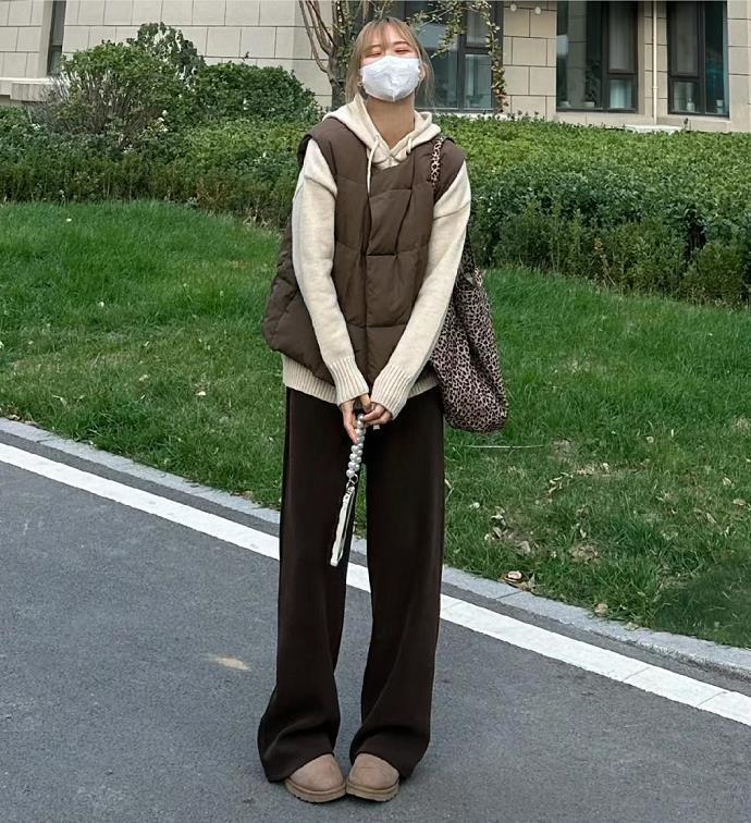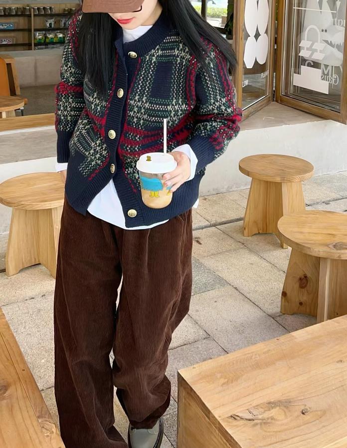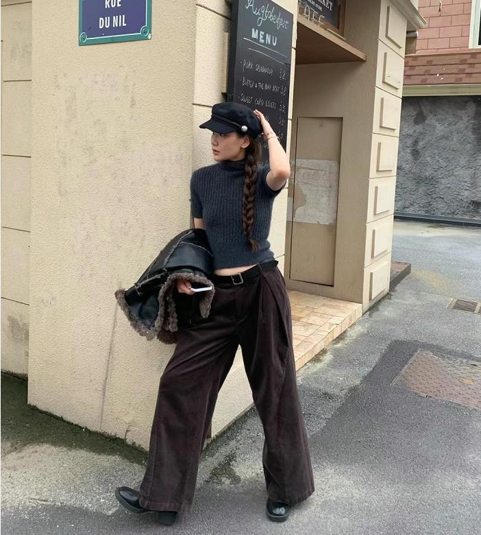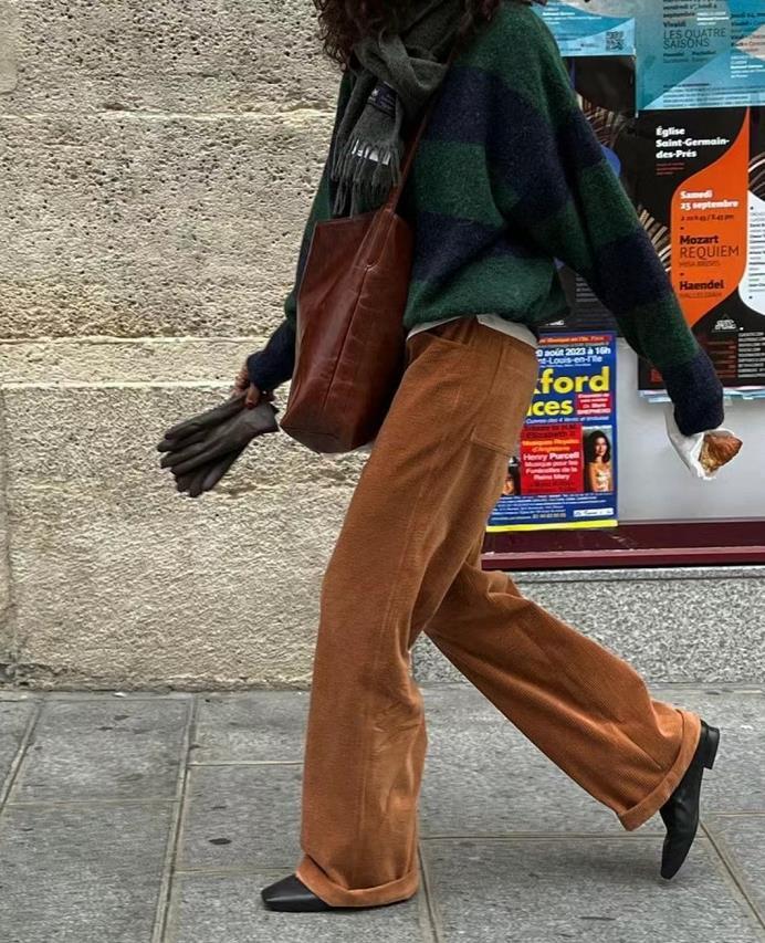 沒有燈芯絨的冬天大概是不完整的吧,咖色的燈芯絨闊腿褲,自帶復古氣息,加上這種絨材質,穿起來就很保暖舒適。