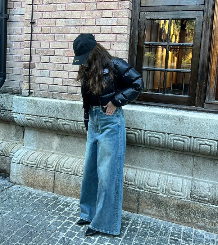 黑色短款羽絨服+牛仔闊腿褲,上短下長的組合,輕鬆優化了整個身材比例,寬度適中的褲型,也很好隱藏了腿粗的缺點,腳下是一雙黑色尖頭鞋,微露出一點鞋頭來,精緻感就流露了。