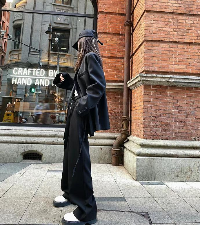 很喜歡這種帶點鬆弛感的衣服,原本是嚴謹正式的西裝,卻因爲寬鬆版型的原因,讓你穿出休閒隨性範。雖是一身黑色,但卻完全不會給人沉悶氣息,內搭白色打底,與鞋子進行了呼應,走路都自帶氣場。