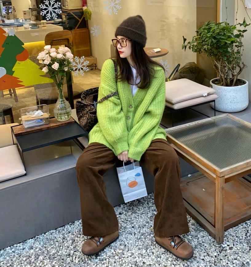綠棕的配色也太好看了吧?滿滿的復古感,綠色毛衣開衫,內搭白色t恤,鬆弛感的穿搭就是讓人喜歡,下身一條棕色燈芯絨褲子,直接將復古風給拉滿了。