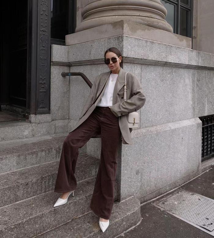 提及到燈芯絨褲,相信很多人都會不由自主想到70、80年代的穿搭吧?深棕的配色,真的滿滿的復古氣息。上衣選擇淺色的來配,深淺的結合,不僅打造出層次感,還很時髦。
