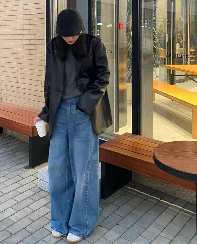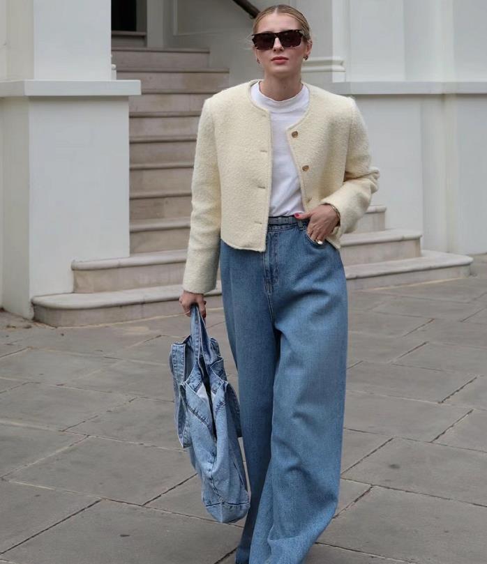 牛仔闊腿褲,可以說是很經典百搭的褲裝了,這種褲子的面料挺括,質感也非常好。選擇長一點的款式,能很好拉長你的下身比例。