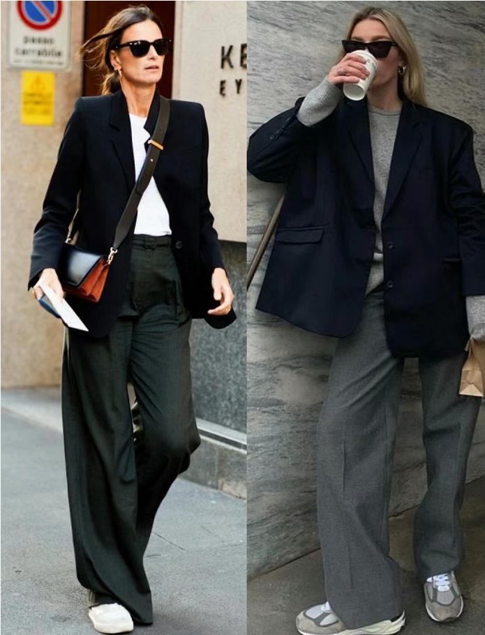 如果穿膩了黑色西裝,那麼就嘗試下淺色系的吧,奶白色西裝外套+西裝闊腿褲,這麼一整體看起來真的很溫柔氣質。搭配運動鞋就非常好看了。