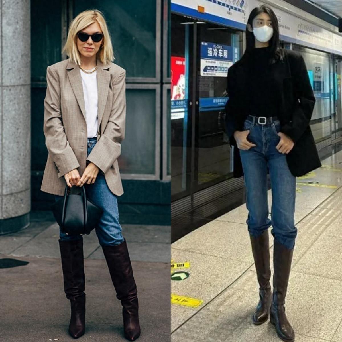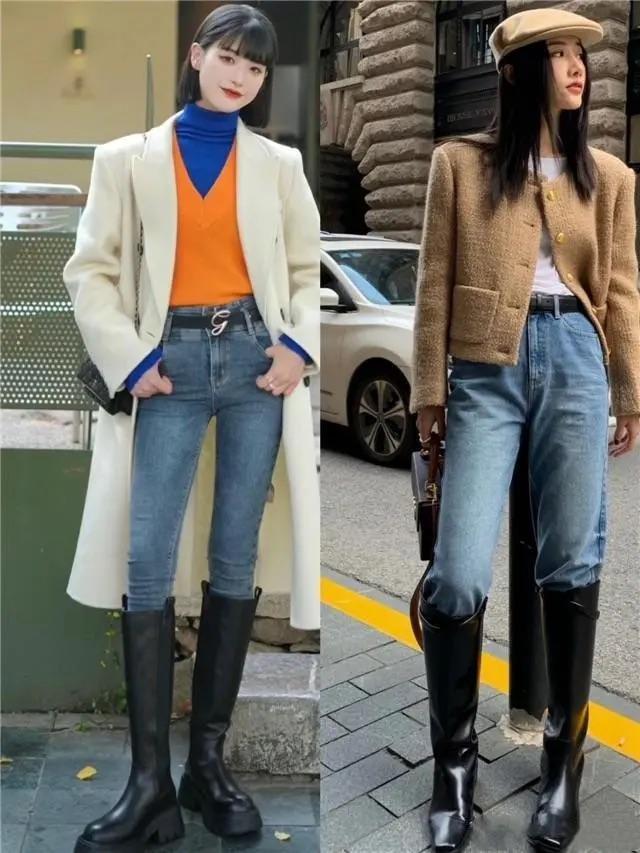 我們可以嘗試修身一點的靴筒,靴筒沒有那麼寬鬆,自然貼合腿型的寬鬆度穿起來就更加舒適。一雙寬度合適的長筒靴,配修身的牛仔褲也會更顯瘦。