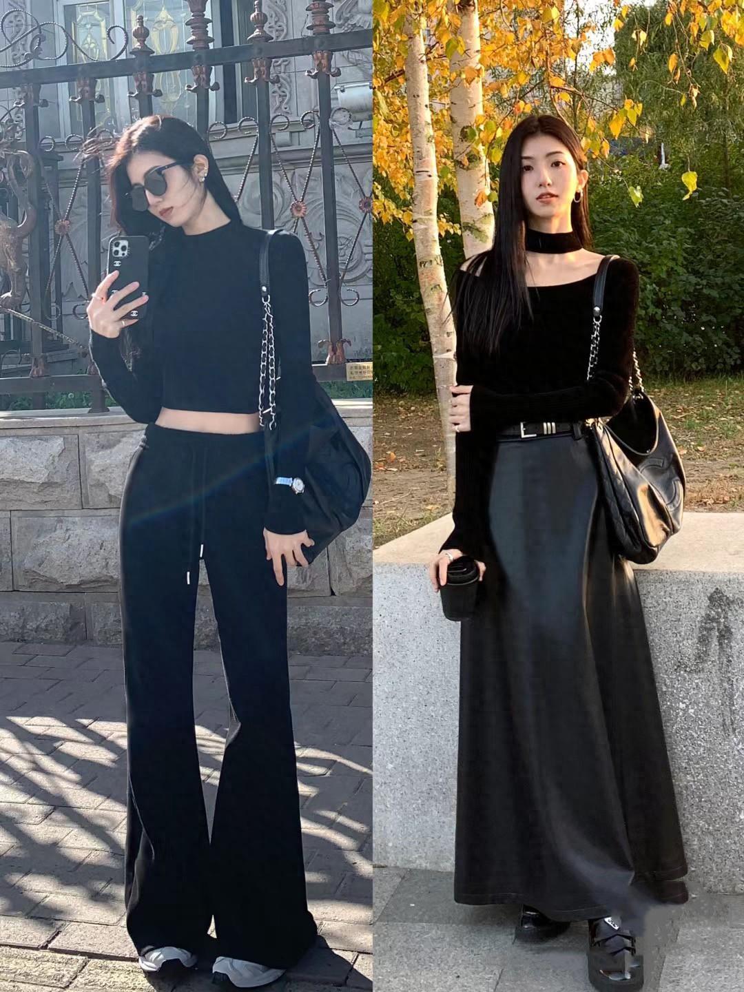 修身的黑色打底衫,我們可以選擇一種露臍或者剛剛及腰的長度,適合腰身纖細、身材曼妙的女性,一身黑色look,可以塑造出高級氣場。