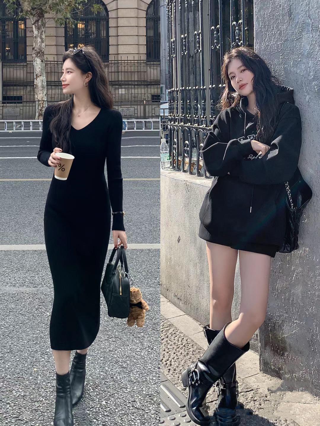 修身的黑色連衣裙,或者慵懶的黑色衛衣,都可以是冬天裏凹造型的單品。如果擔心黑色衛衣不夠精緻,我們可以配長筒靴來塑造時尚感。