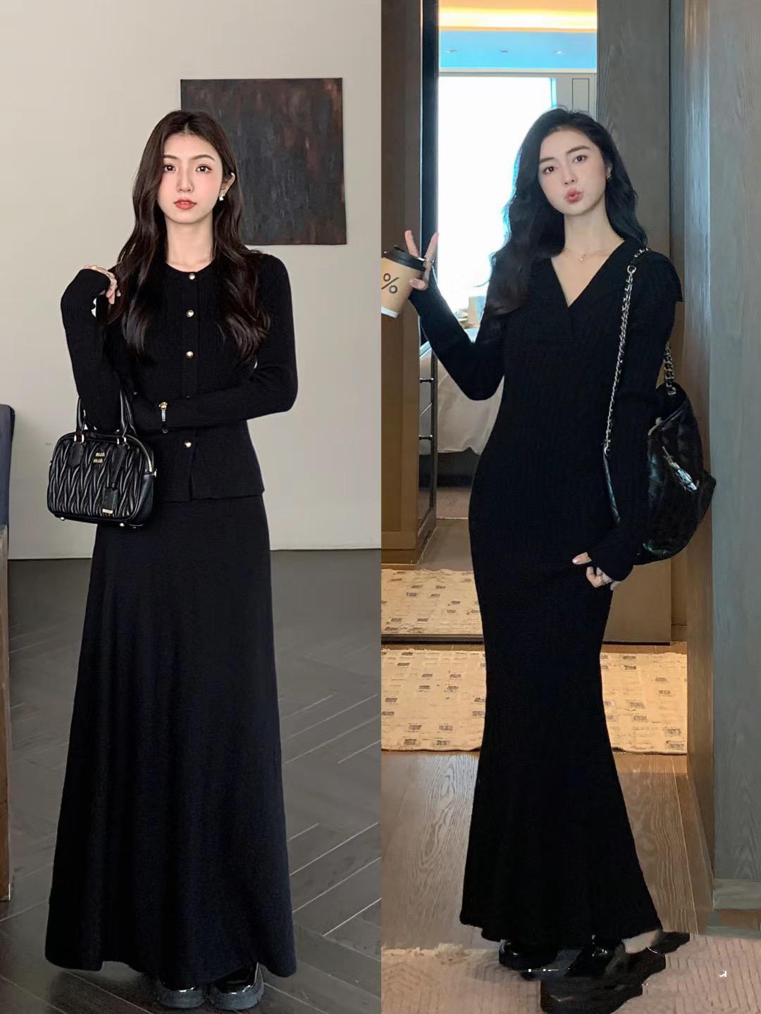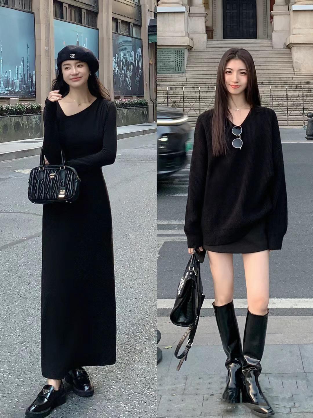 年底各種聚會也多了起來,如果你想要豔壓羣芳,還是建議大家選擇all black的穿搭呀,黑色連衣裙,黑色針織開衫,黑色半身裙,黑色小皮鞋,都可以安排起來,尤其是黑色半身裙,搭黑色小香風上衣,也很精緻。