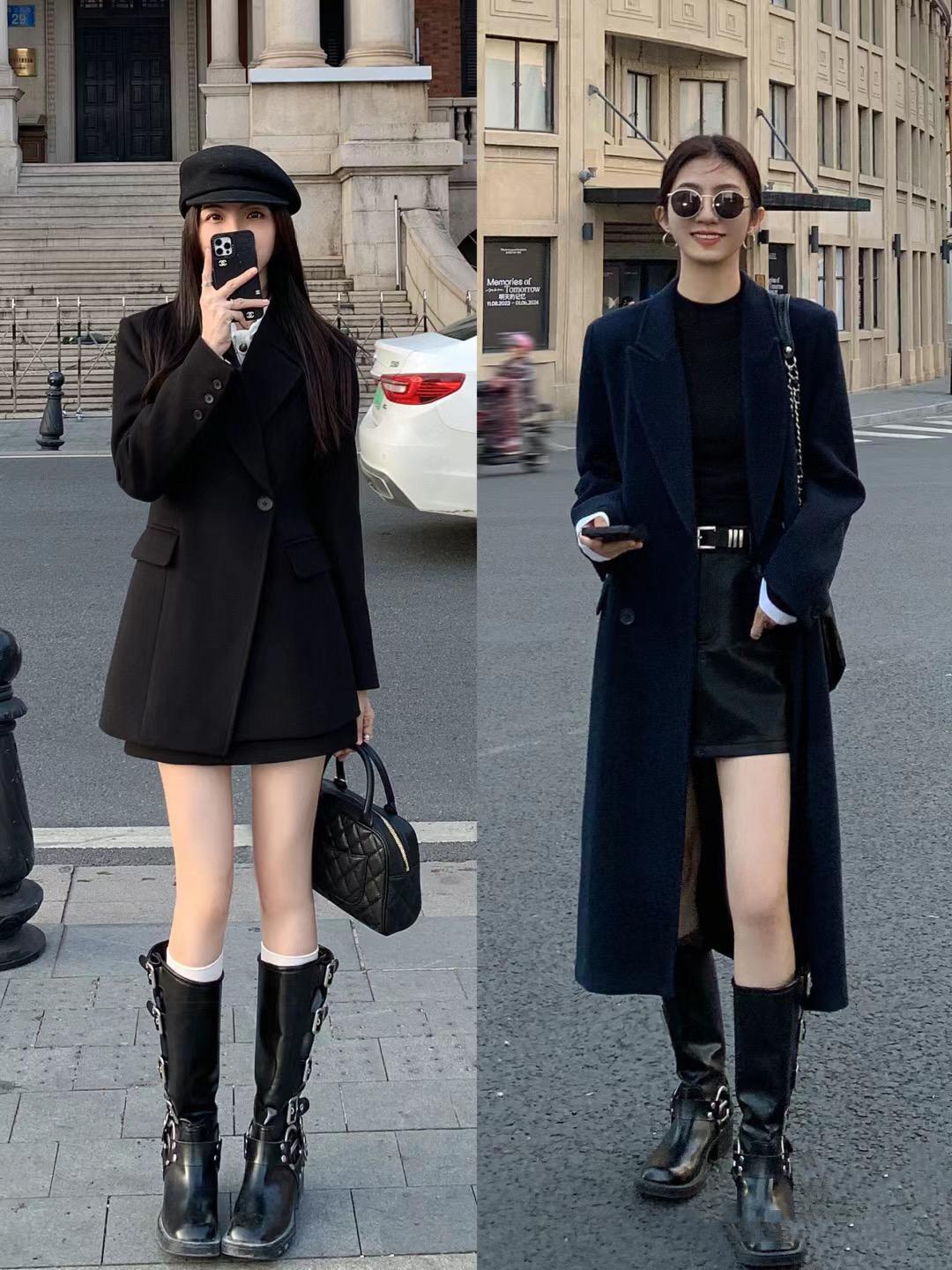 即便是小個子的女生,也喜歡all black的穿搭。中長款的西服外套,搭配及膝的長度,可以呈現出優越的雙腿線條,讓小個子也擁有大長腿的既視感。