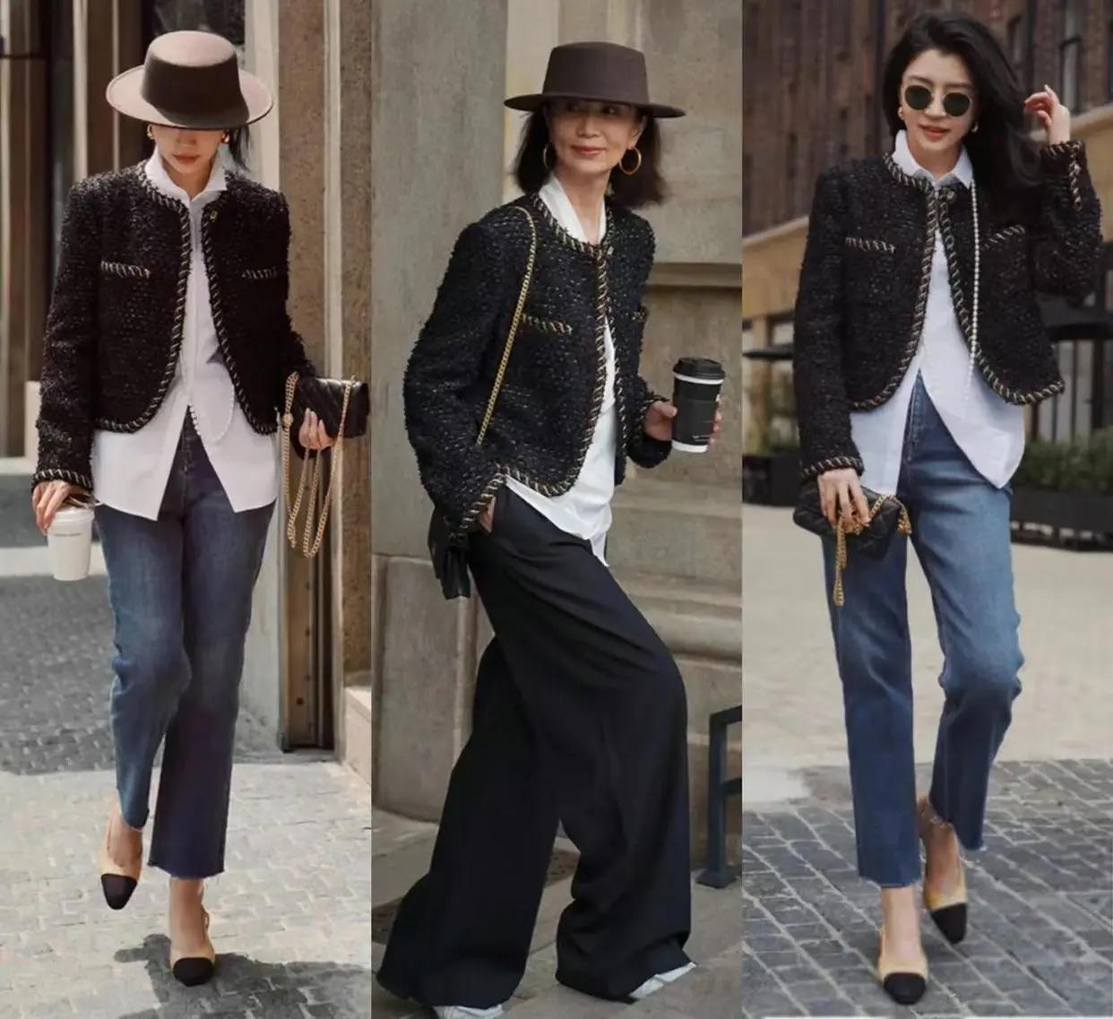 黑色系的小香風外套,搭配寬鬆的白色襯衫來穿着,形成了鬆弛有度的對比。疊搭直筒的牛仔褲,既包容了腰臀部的線條、又表現出雙腿的修長。直筒牛仔褲的穿着,可以塑造出大長腿的既視感。