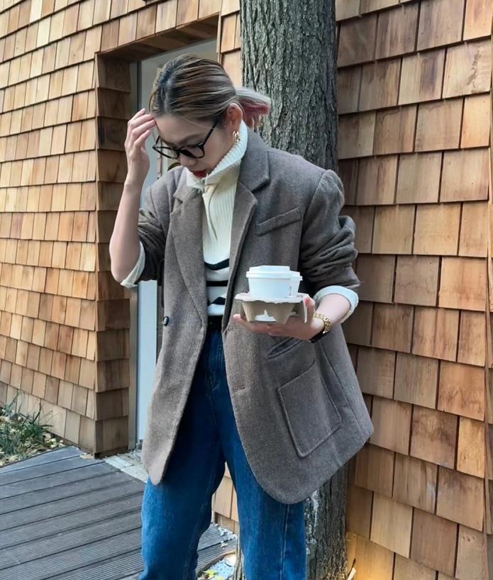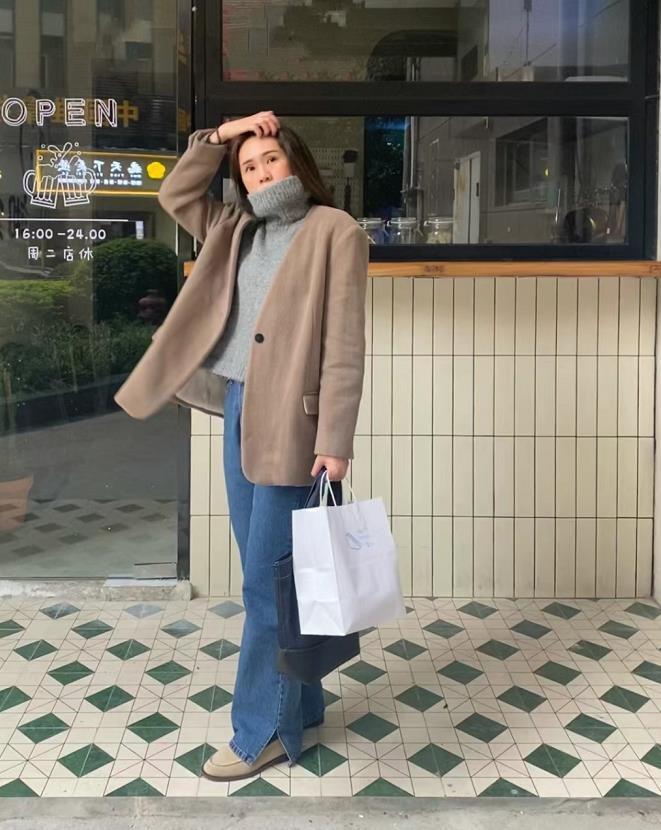 西裝配高領毛衣的疊穿真的非常保暖,搭配牛仔褲,簡簡單單又時髦,不管是日常通勤,還是逛街都挺合適。