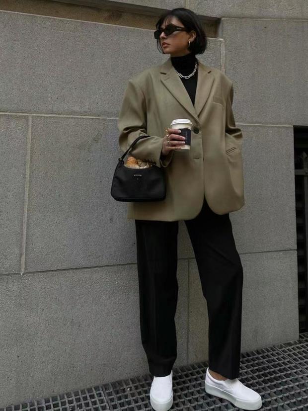 今年西裝外套也成爲了時尚圈裏備受追捧的單品之一,和大衣一樣,在秋冬日常出鏡率也比較高。廓形的西裝外套,寬鬆舒適又藏肉,內搭選了灰色高領毛衣,真的很保暖。