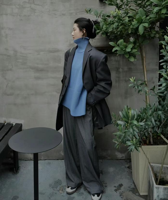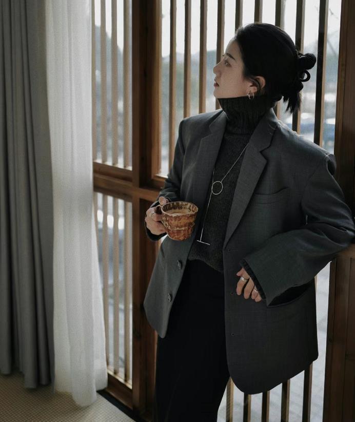 黑色高領毛衣,可以作爲任何外套的打底,超級耐看顯瘦和百搭的,寬鬆版型的西裝外套,給你帶來更多的是休閒,當然也少不了幹練氣質。