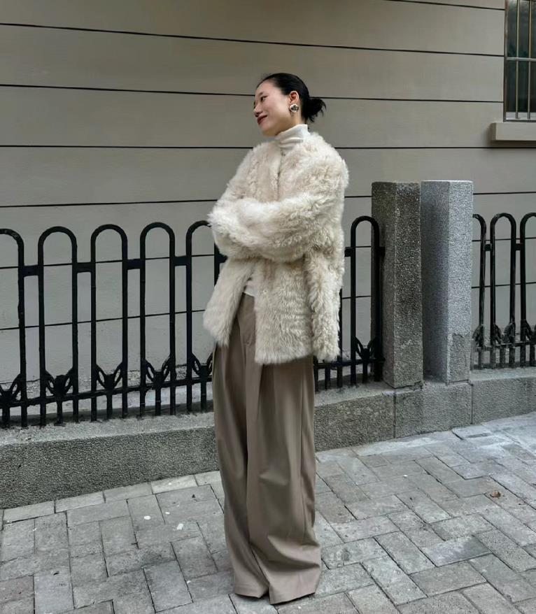 大降溫,保暖還得是皮草外套,毛毛款式的外套,上身真的好好看,也非常時髦。內搭選擇修身一些的高領打底毛衣,這樣就不用擔心會顯胖了。