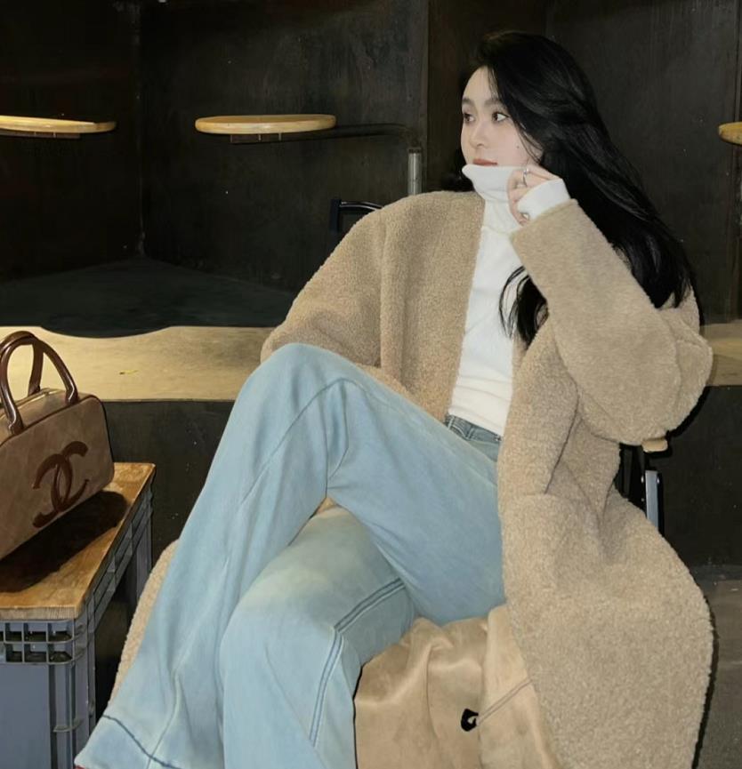 喜歡這種奶黃色的毛毛外套,感覺穿起來超級溫柔的,也非常顯白,選擇高領毛衣進行內搭,很好保證了穿着溫度。