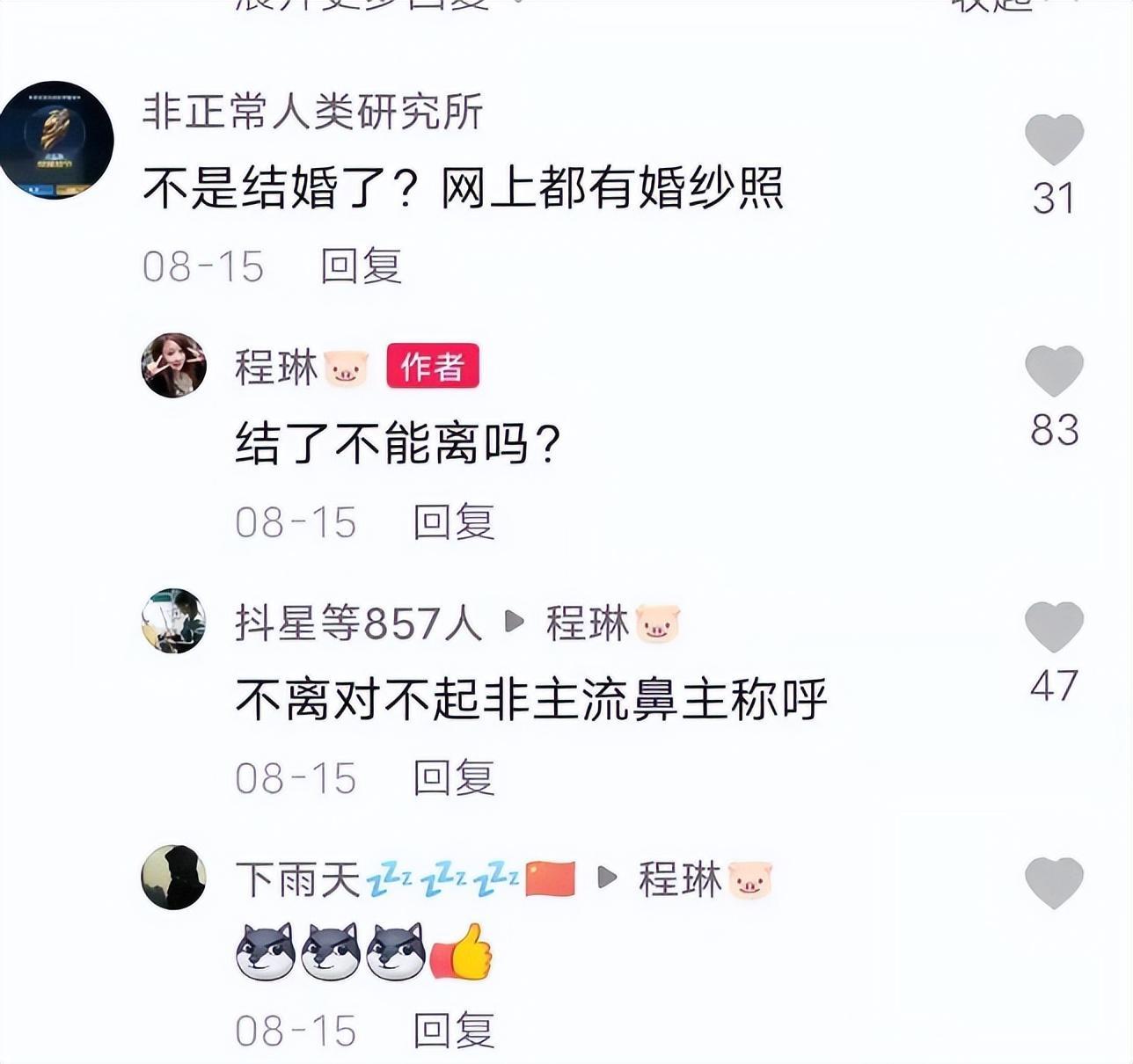 時光飛逝,程琳也在2022年註冊了自己的短視頻賬號,當有人問她感情問題時,她表示自己離婚了。