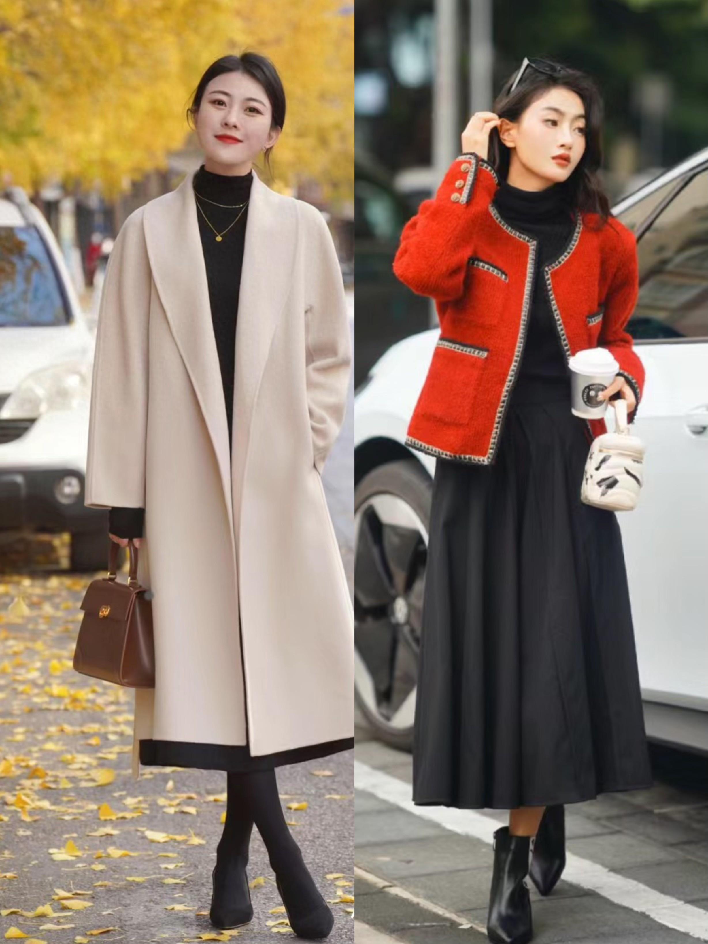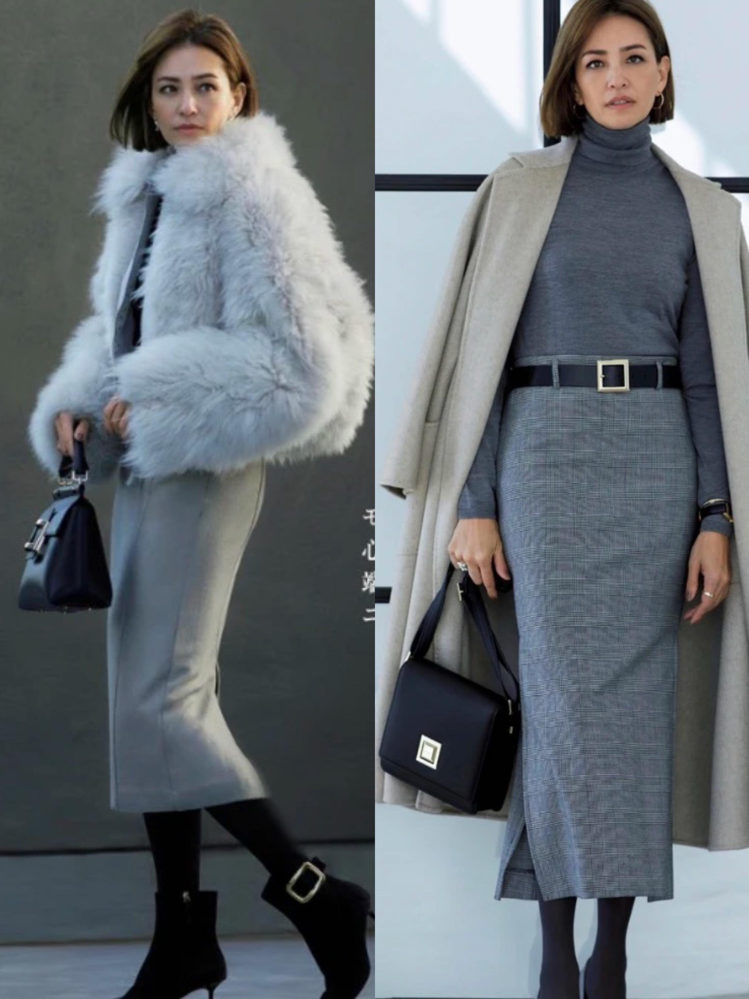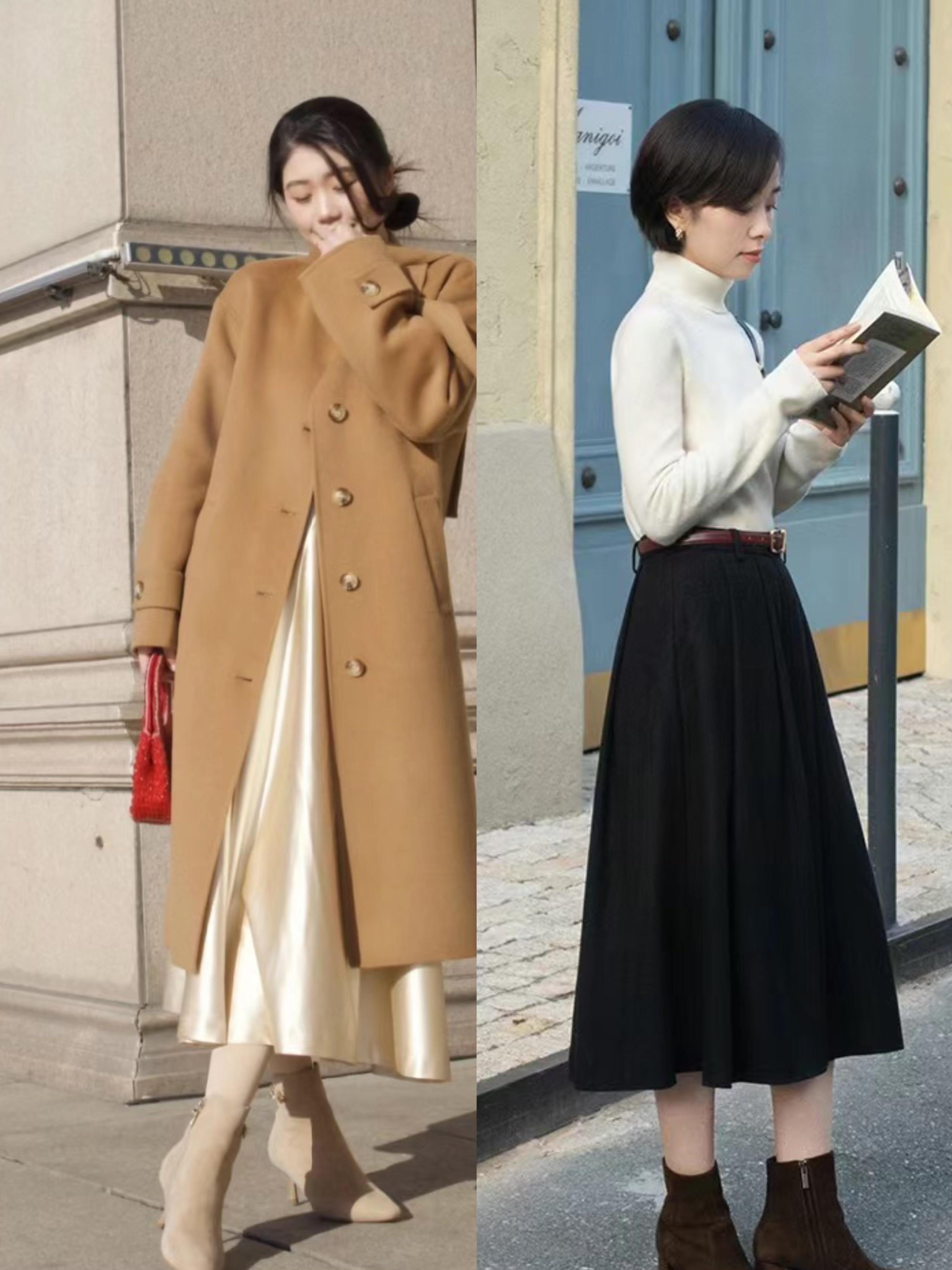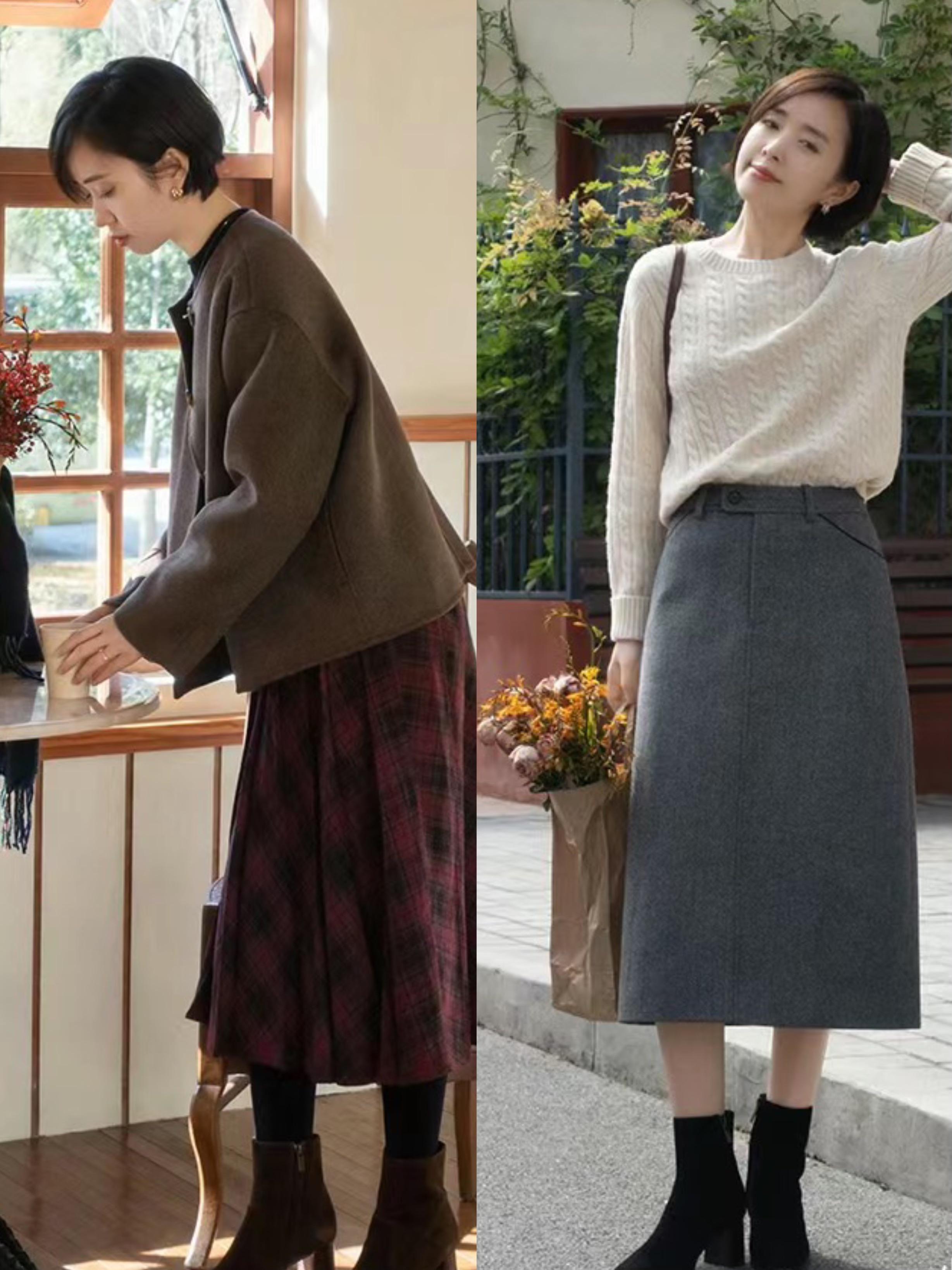 面料厚實的毛呢半身裙,不僅更加挺闊、也更加防風保暖。因爲毛呢面料比較厚重,不適合做出各種造型,可以選擇簡約的A字形或者利落的H型裙襬,大方保暖還耐看。