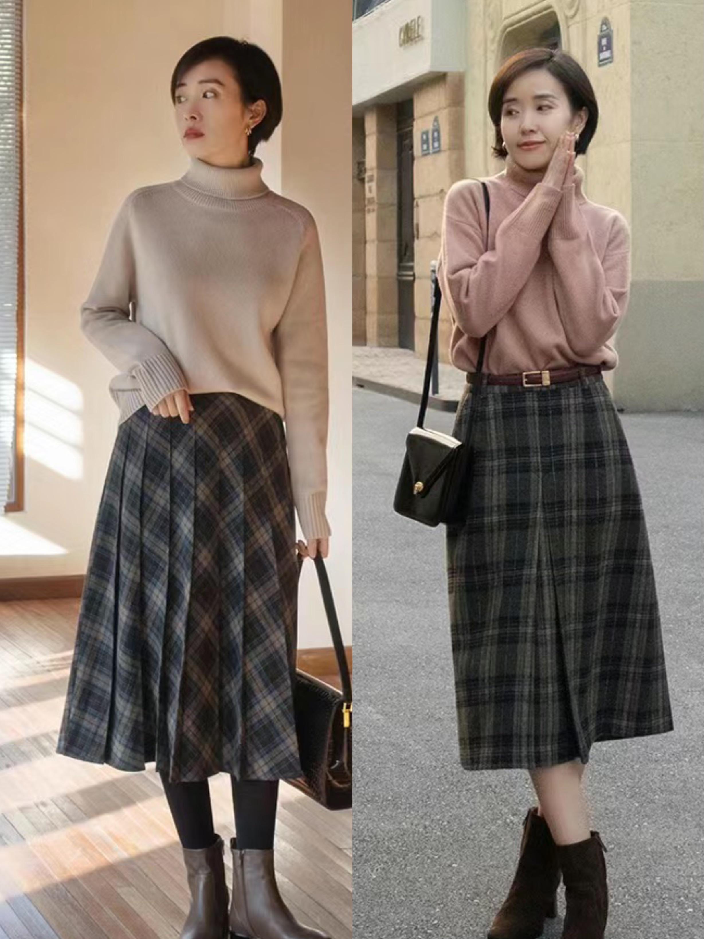 稍微寬鬆的毛衣或者打底衫,下襬直接塞進格子半身裙的裙腰裏,有一種溫柔又精緻的美。基礎款的毛衣或者打底衫,配格子元素的半身裙,簡簡單單又很洋氣。