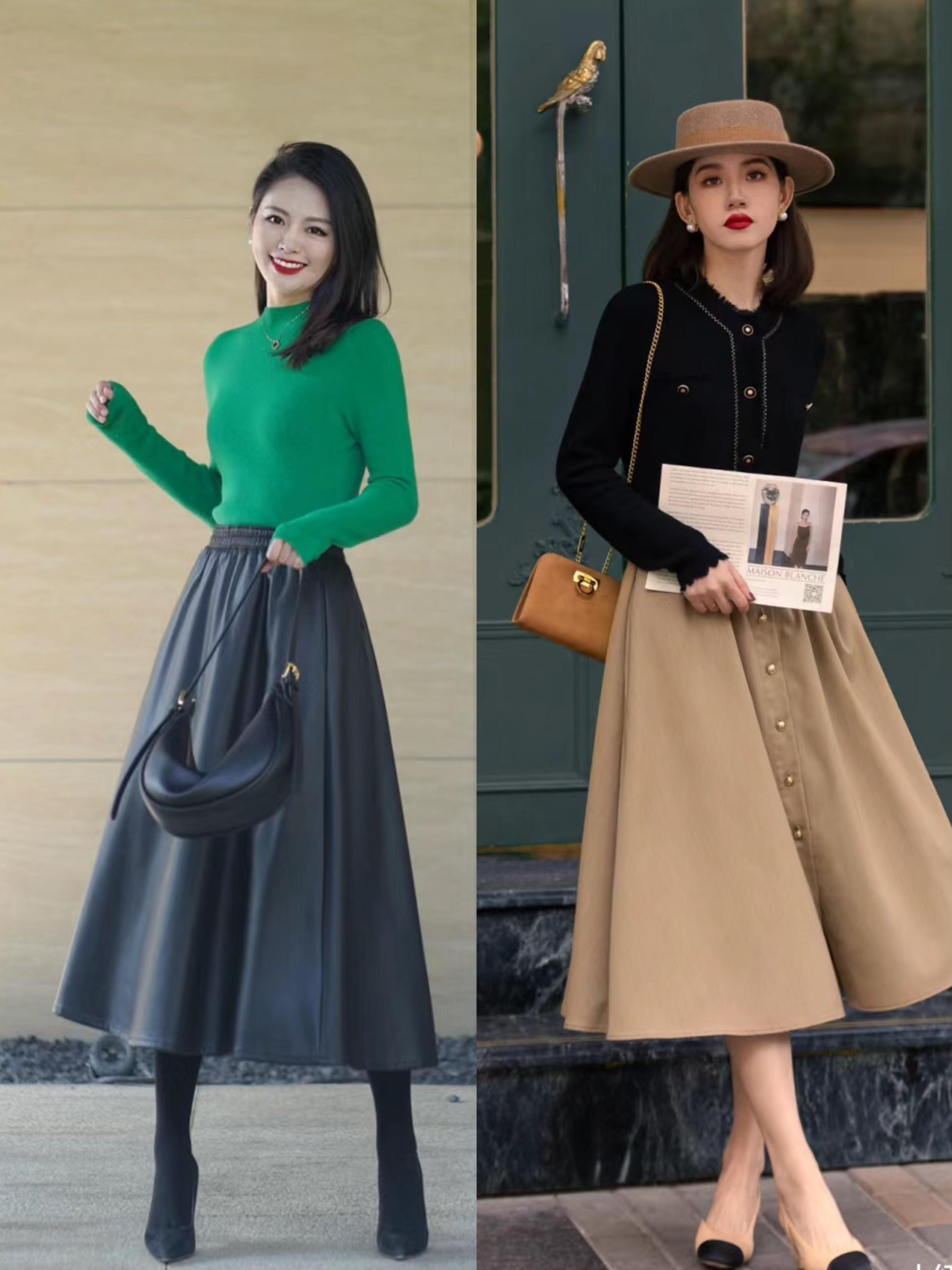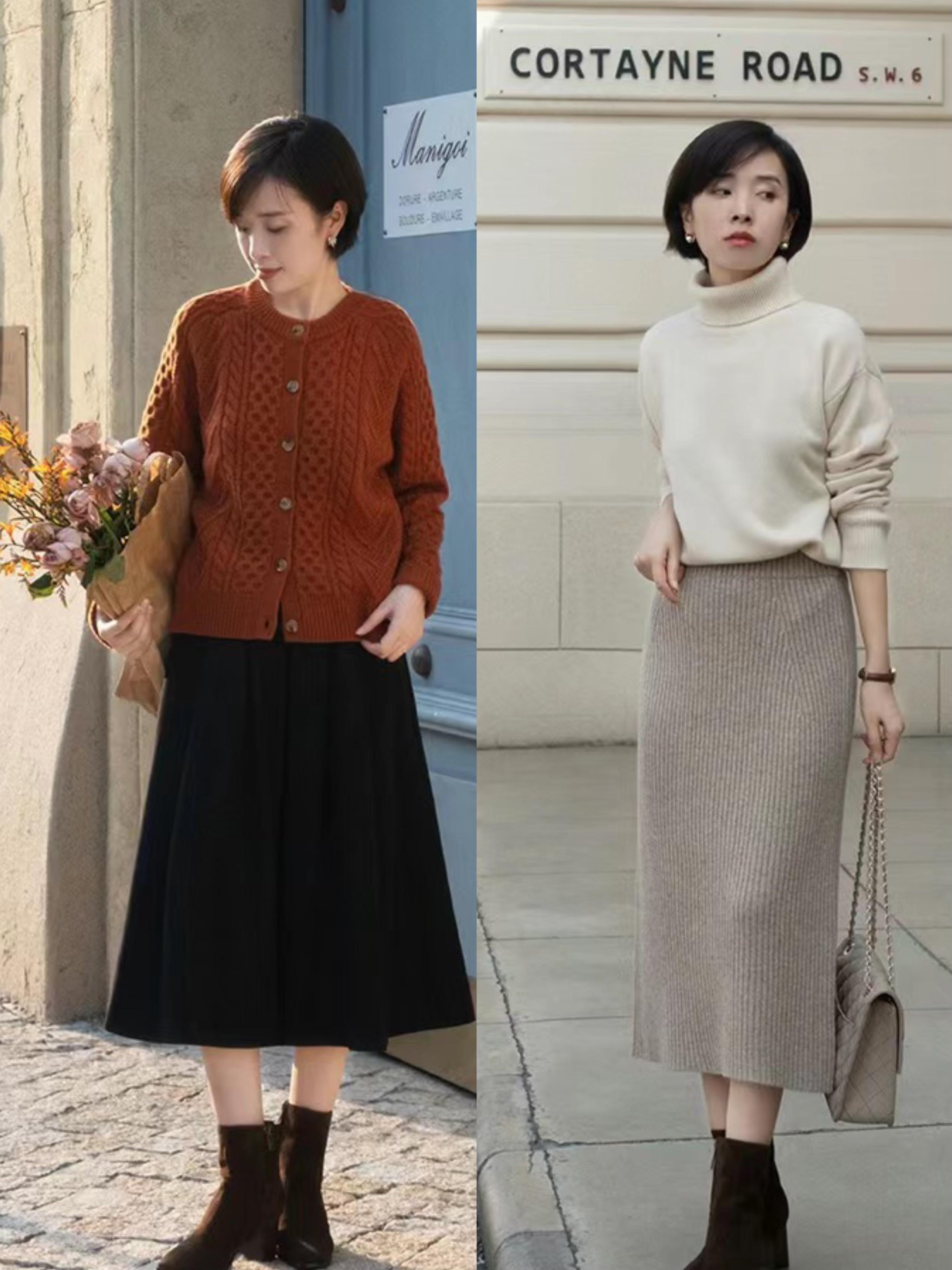 米白色的毛衣配上燕麥色的半身裙,就是一種經典的順色搭配,溫柔嫺靜。橘紅色毛衣配黑色半身裙,就是典型的撞色搭配,時髦醒目。黑色半身裙,大方又顯瘦,配短靴穿着也很洋氣。