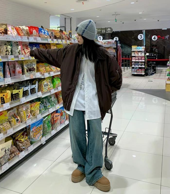 這件深咖色的飛行夾克棉服,真的是自帶復古氣息啊,長度的設計很合理,不長也不短,穿起來剛剛好。內搭進行疊穿,棉服敞開來穿,很顯層次又時髦。搭配一條拖地牛仔褲,挺顯隨性的。