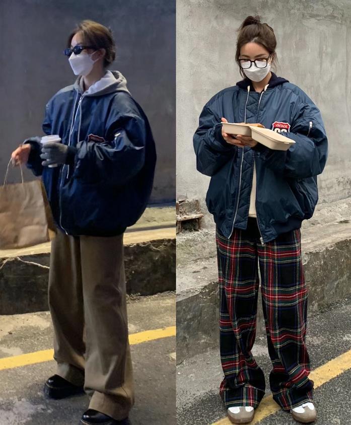 內搭可以選擇毛衣,連帽衛衣來配,再搭配復古配色的褲子,真的相當有美劇裏的復古感呢。