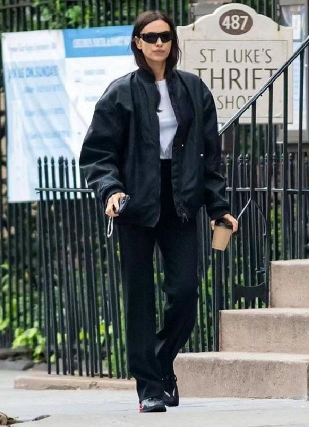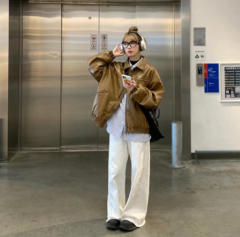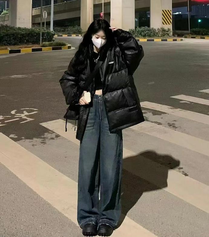 這一套也太酷了吧,黑色內搭+同色系pu皮棉服,顏色一致,看起來就更和諧了,搭配一條做舊的拖地褲,顯瘦顯高又酷,真的很絕。