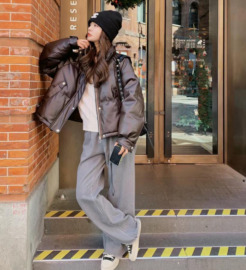棕色皮棉服外套,真的超級適合冬季的,這個顏色看起來也非常洋氣,因爲是皮材質,所以瞧着會多了些甜酷的味道。搭配上想要避免過於臃腫,內搭和下裝所選擇的單品質感要好,版型也好把握得當。
