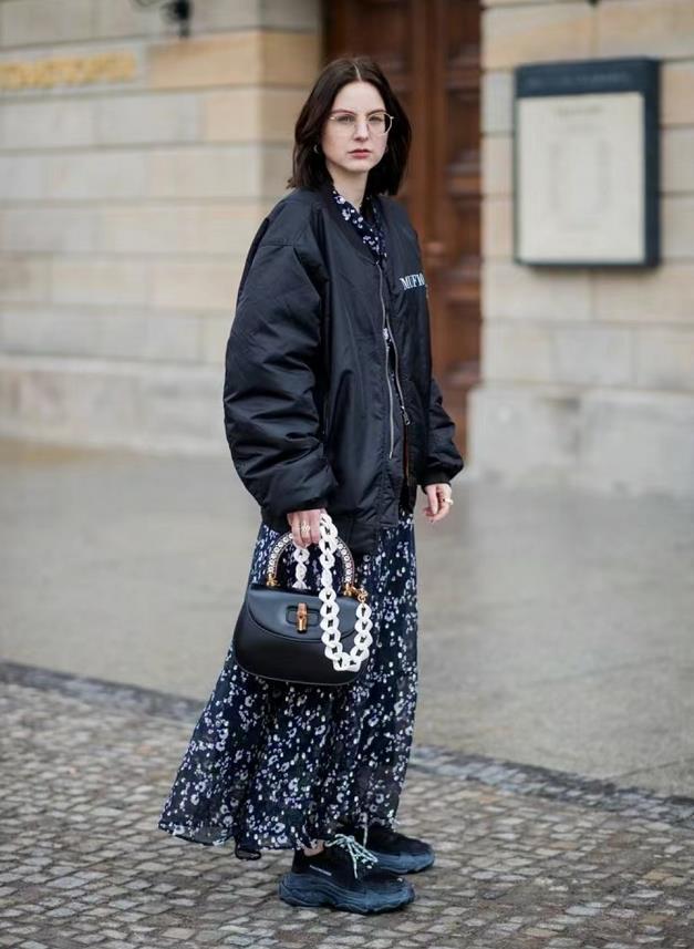 黑色飛行夾克棉服+碎花連衣裙,一簡一繁的組合,可是很顯層次感的,因爲融入了浪漫的碎花裙,讓原本有些酷帥感的棉服外套,也多了幾分柔和。