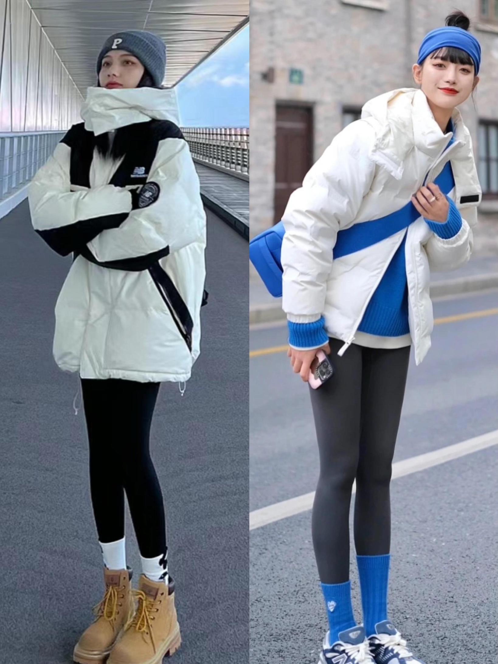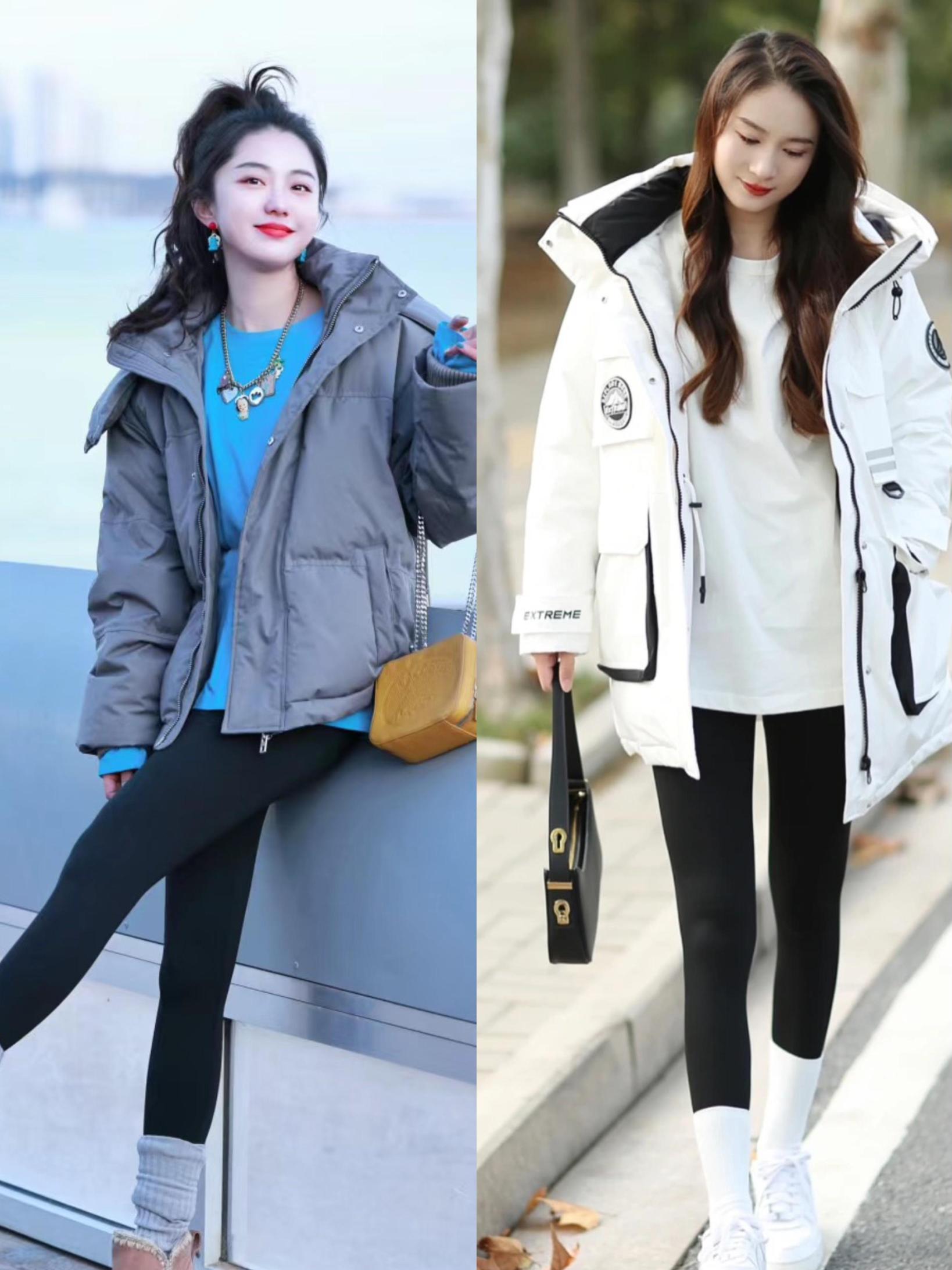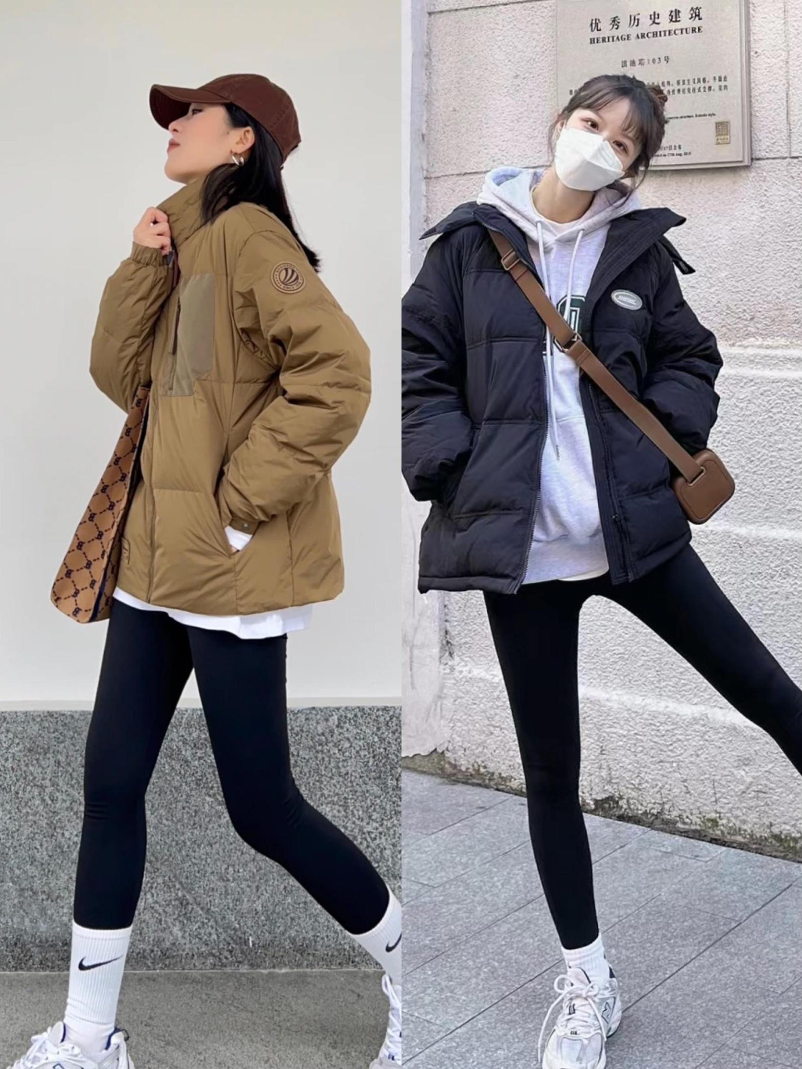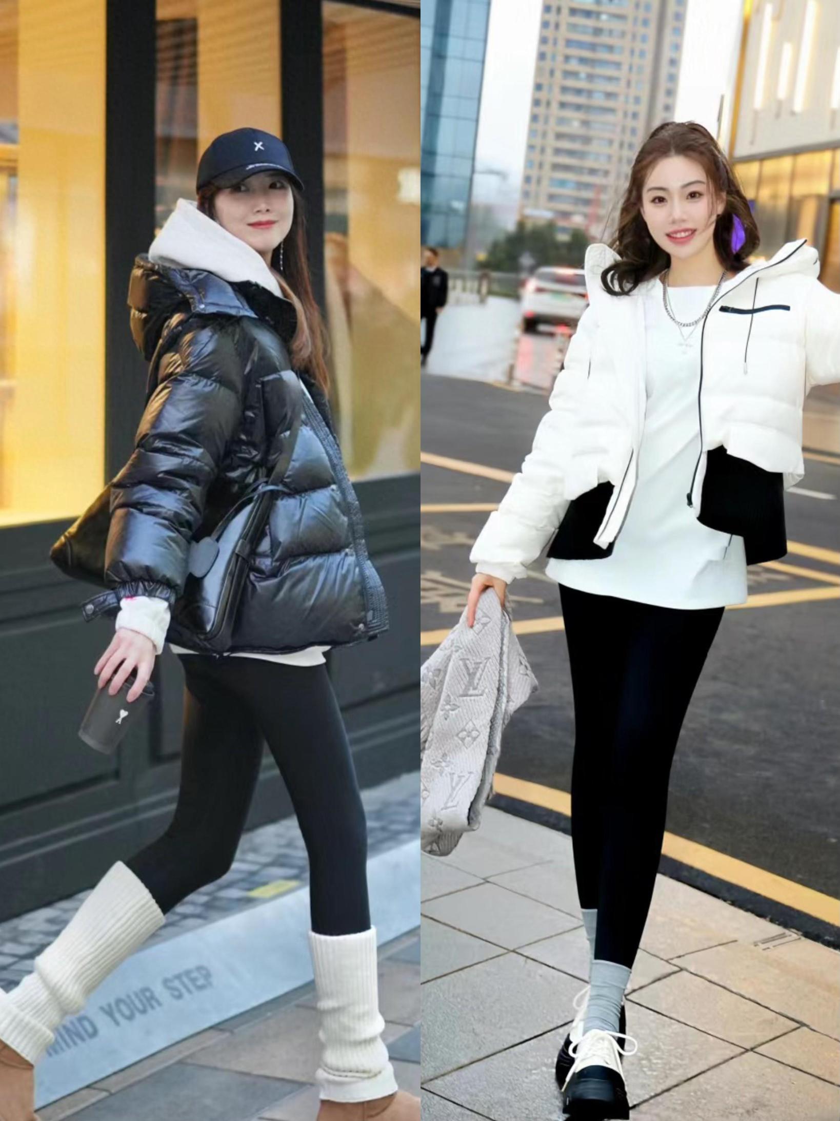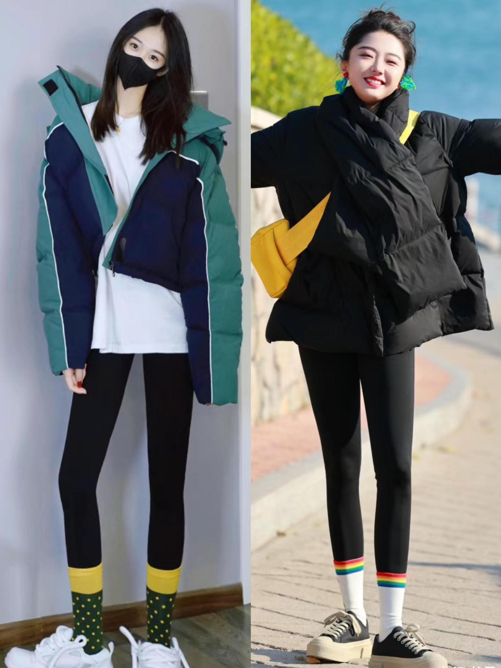 短款羽絨服+鯊魚褲,更自信的秀出雙腿線條