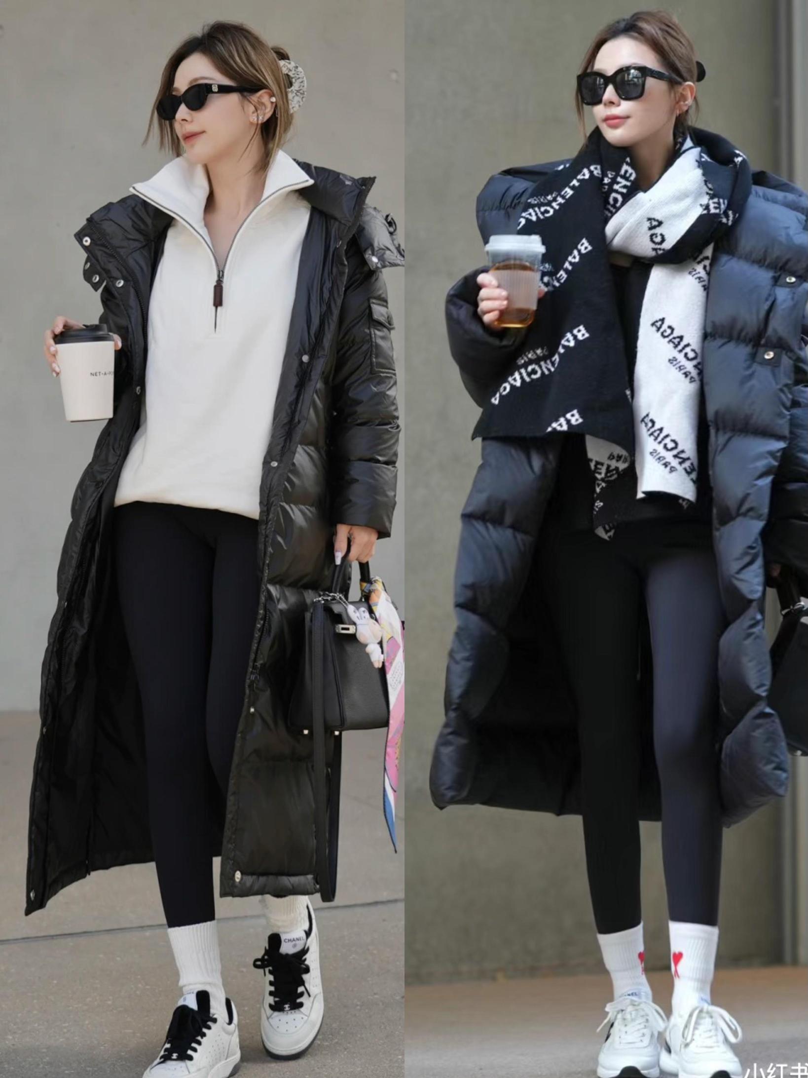 長款的黑色羽絨服,有着像棉被一樣的溫暖。搭配修身的黑色鯊魚褲,可以顯得雙腿線條更加筆直修長。鬆弛有度的對比,利落保暖又不會顯得邋遢,配白色運動鞋、活力十足。