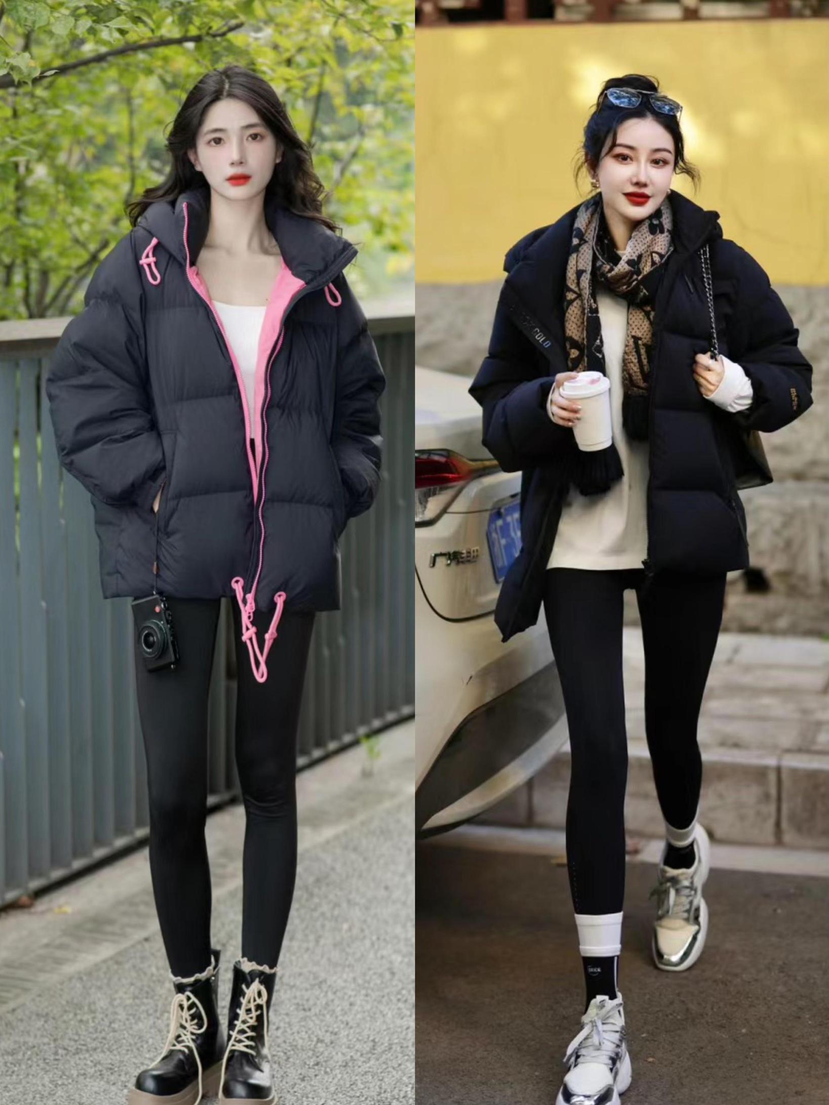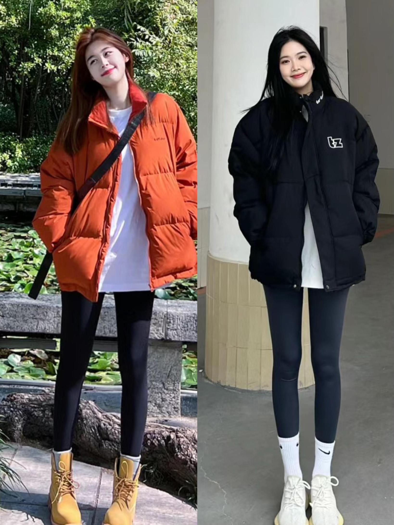 中性風的羽絨服,可以搭配修身效果更加明顯的鯊魚褲。寬鬆又筆挺的中性風羽絨服,配上緊緻修身的鯊魚褲,更添了幾分酷颯,勾勒出雙腿線條、顯高效果也不錯。