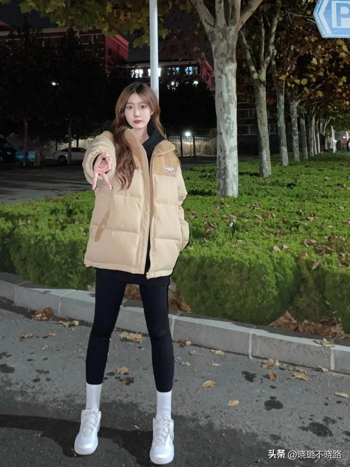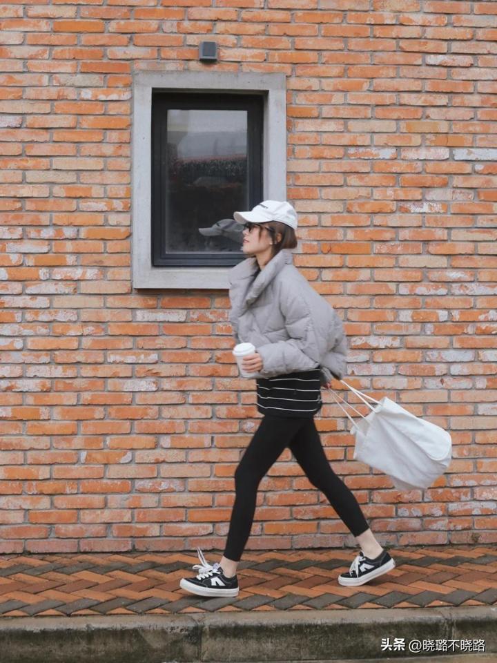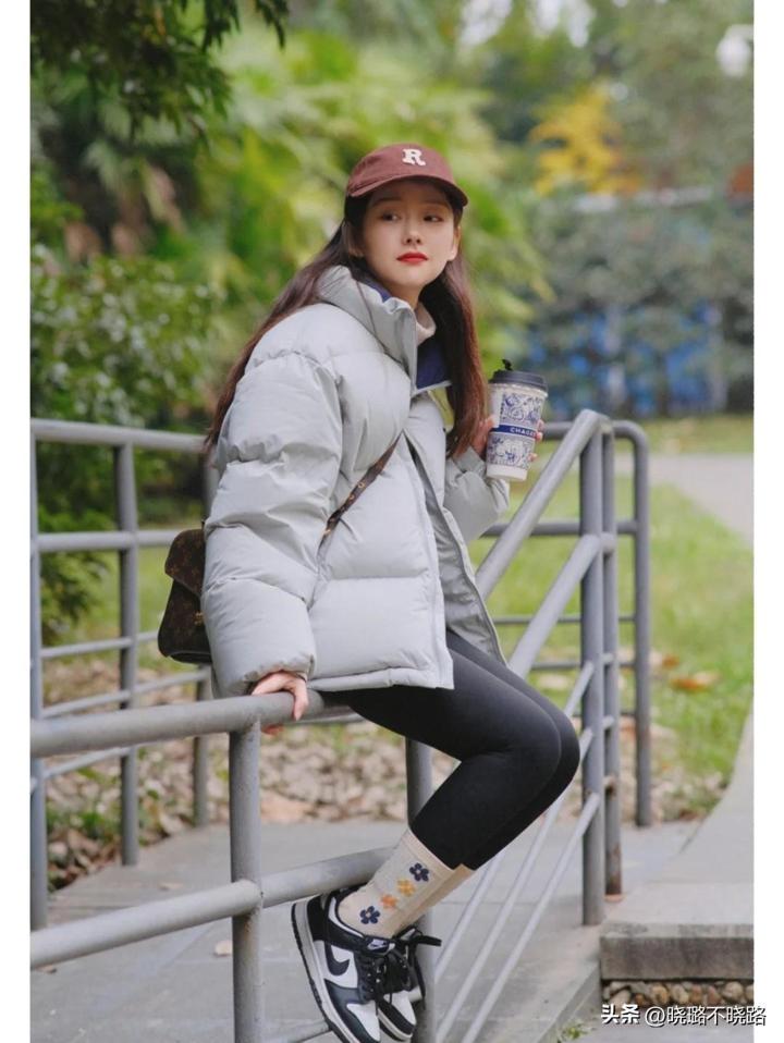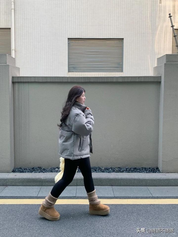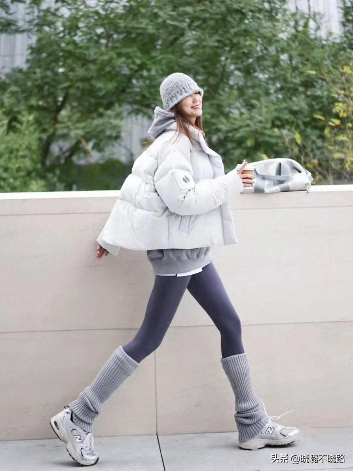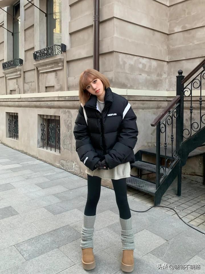 接着給大家推薦的,是及臀款的棉服和鯊魚褲組合。這種剛好能包裹住臀部的款式穿着很有“安全感”,也能最大程度上幫助展現出腿型的優勢。