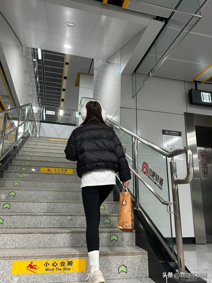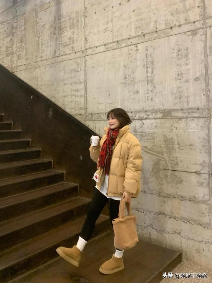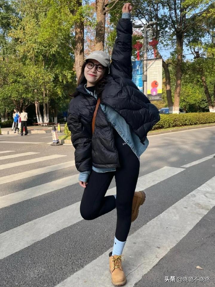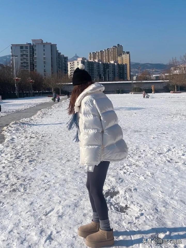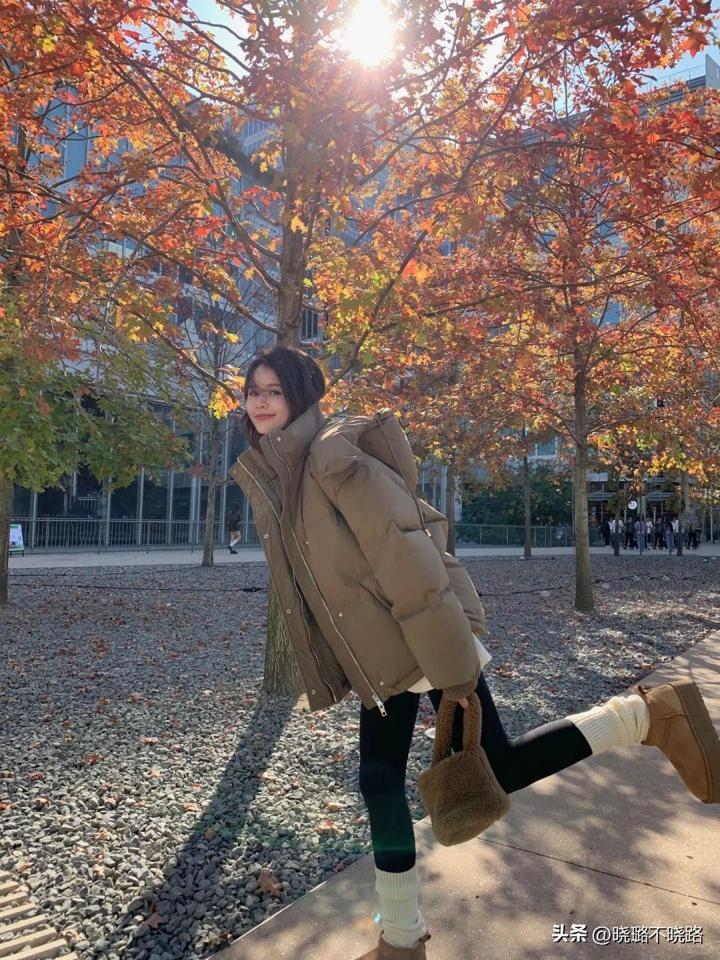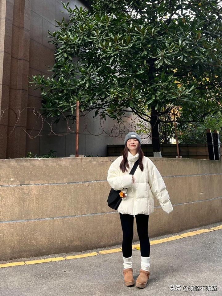 接着給大家推薦的,是及臀款的棉服和鯊魚褲組合。這種剛好能包裹住臀部的款式穿着很有“安全感”,也能最大程度上幫助展現出腿型的優勢。