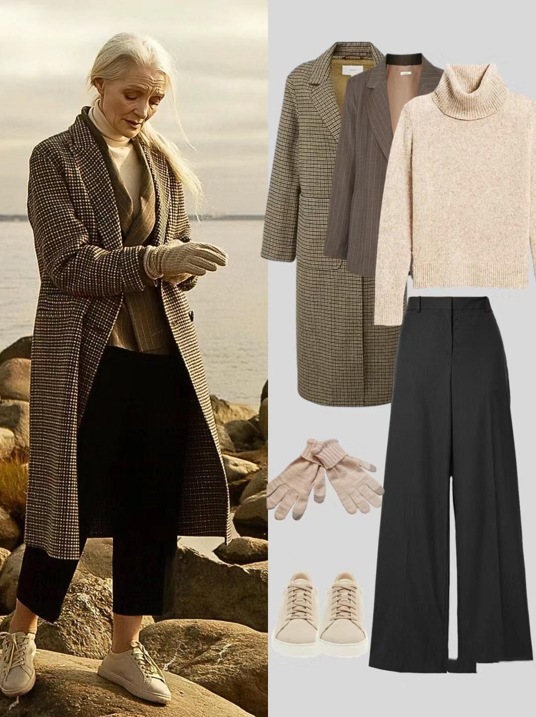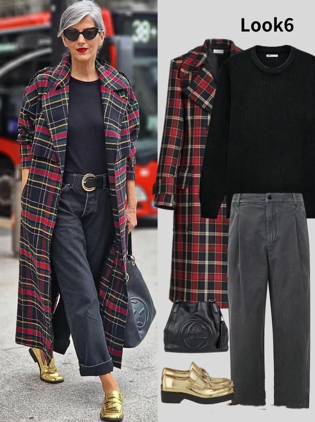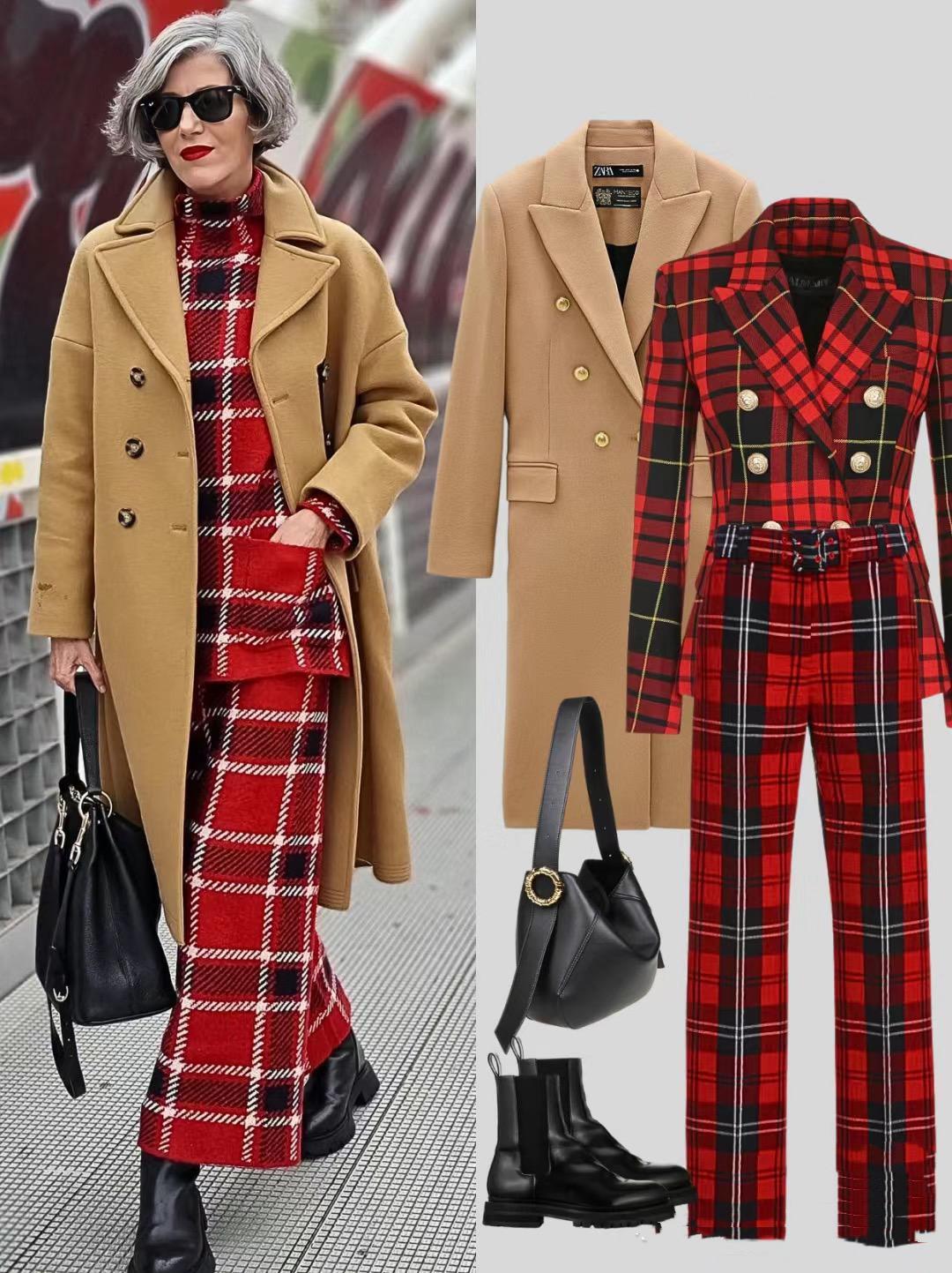 60+奶奶輩的穿搭,依然是精緻體面又時髦的。我們穿高級感十足的格子大衣,可以配高腰的黑灰色直筒褲,簡簡單單就很大方。