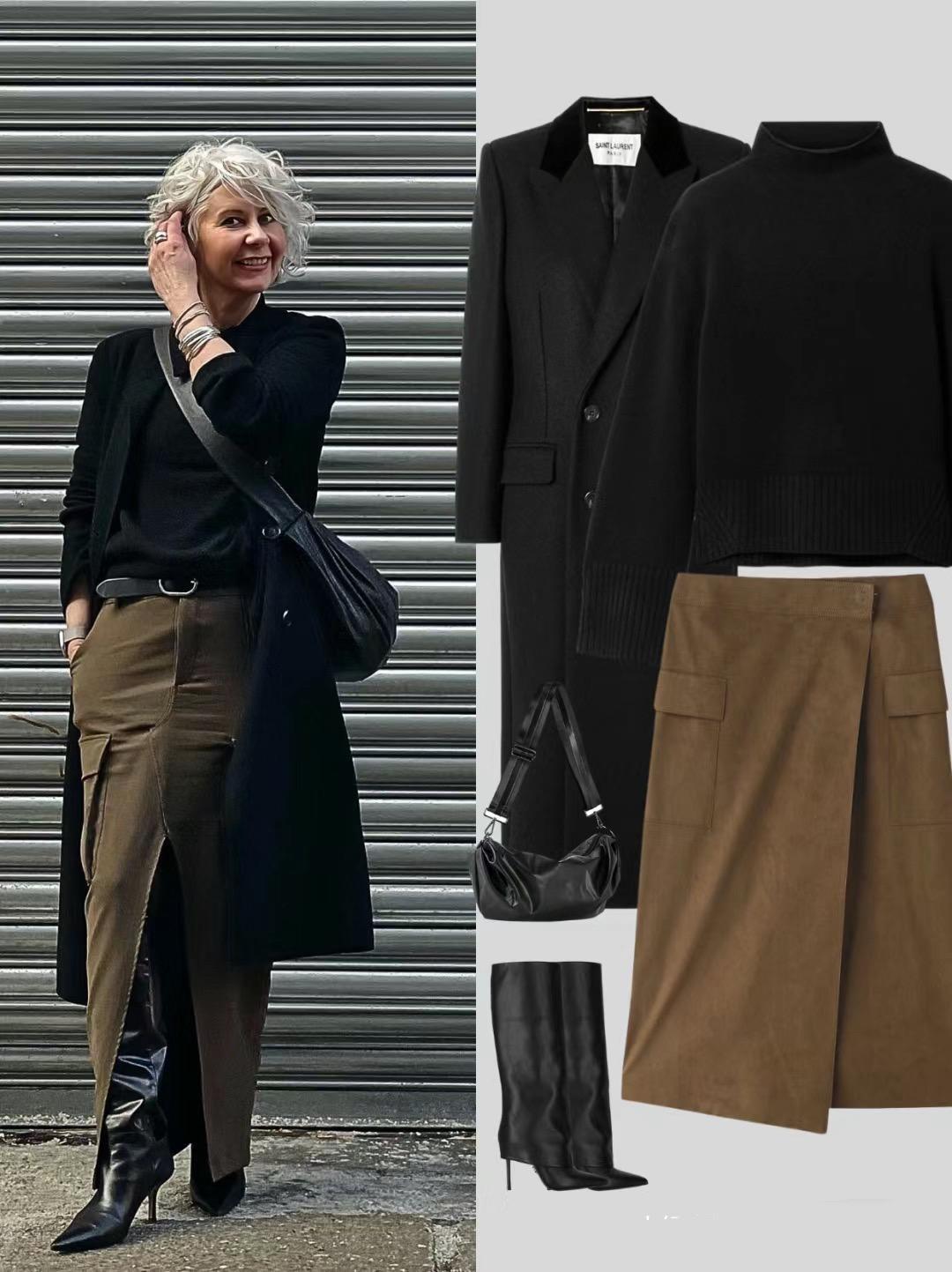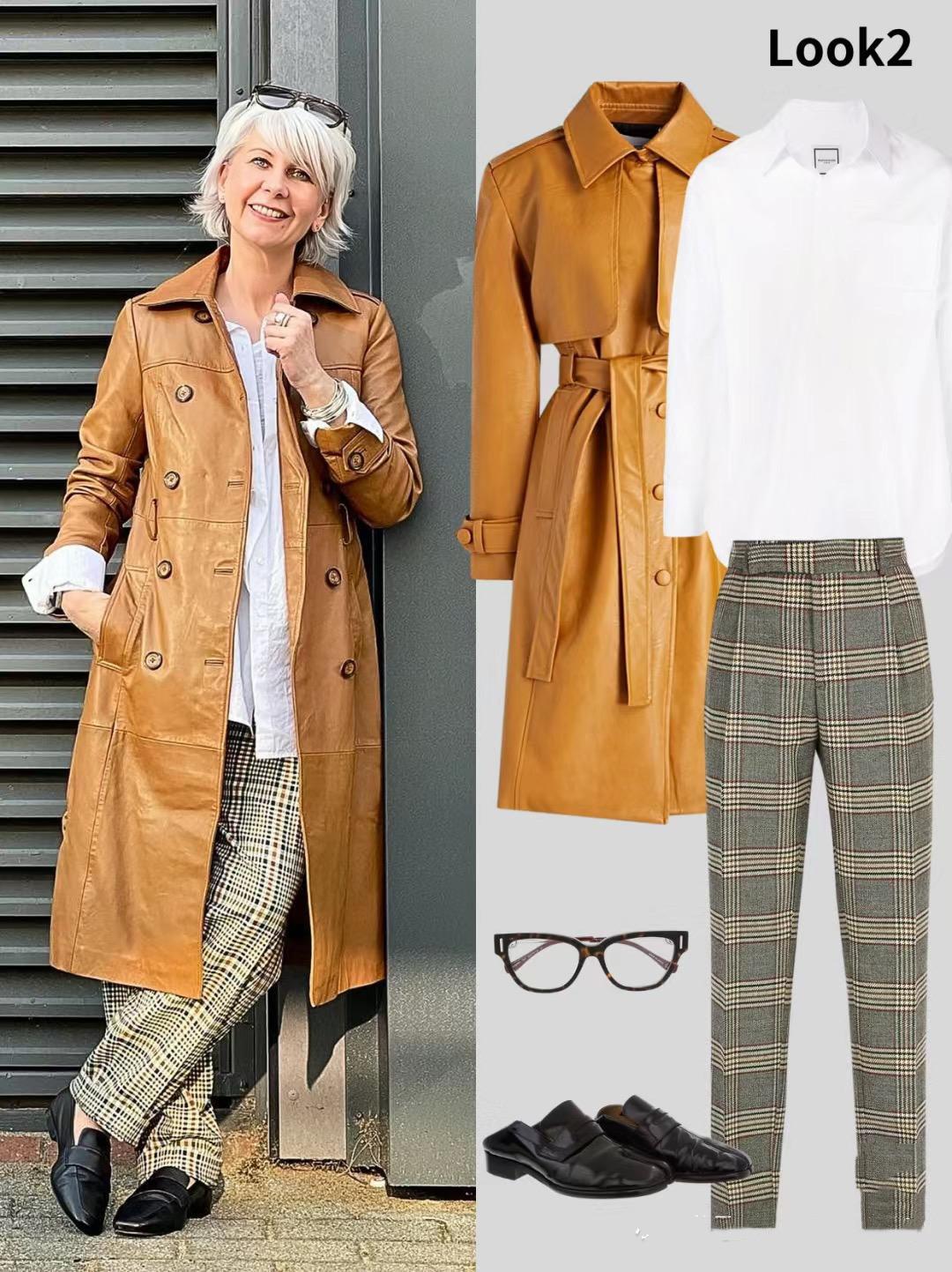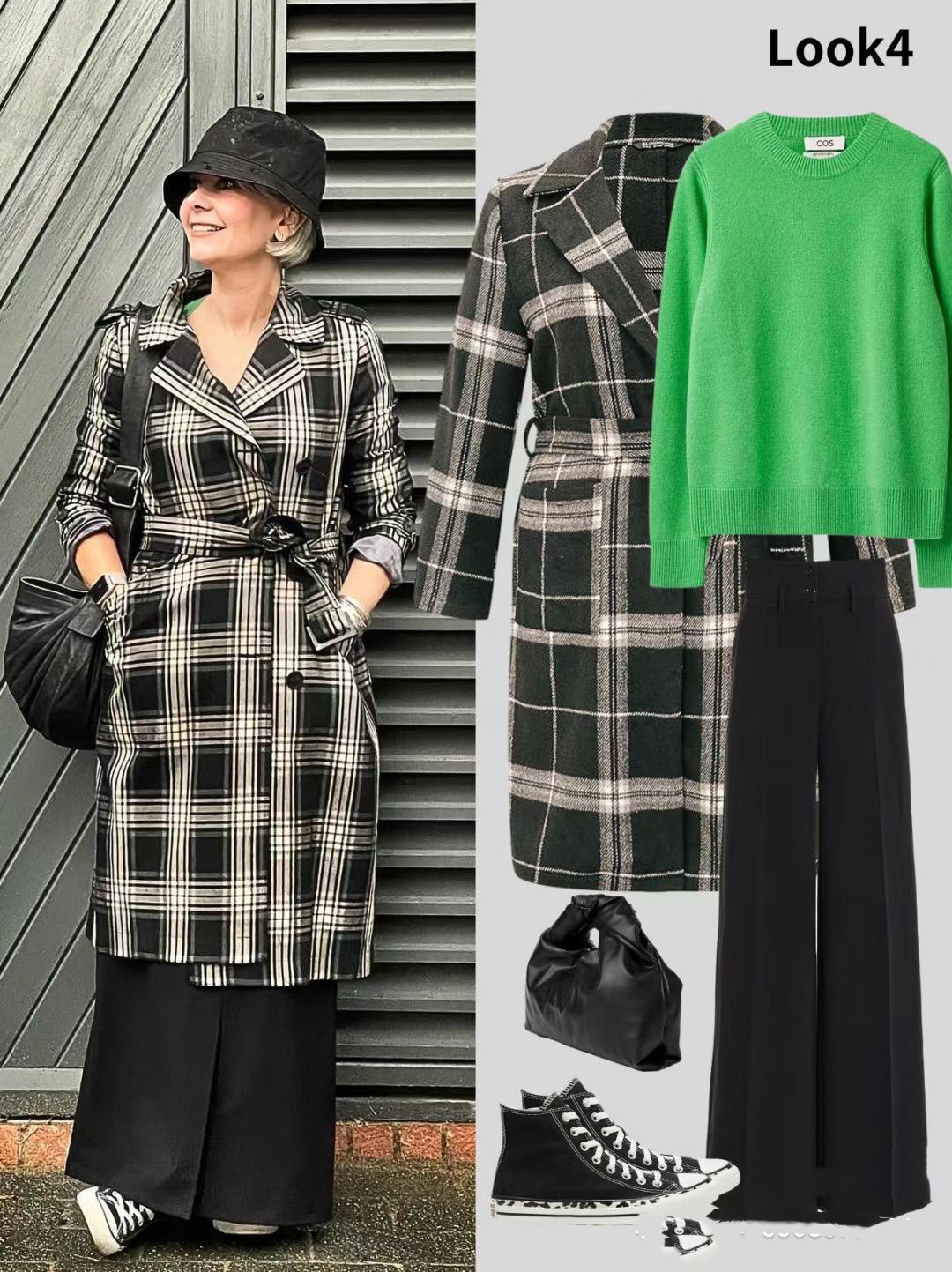 60+奶奶輩的穿搭,依然是精緻體面又時髦的。我們穿高級感十足的格子大衣,可以配高腰的黑灰色直筒褲,簡簡單單就很大方。