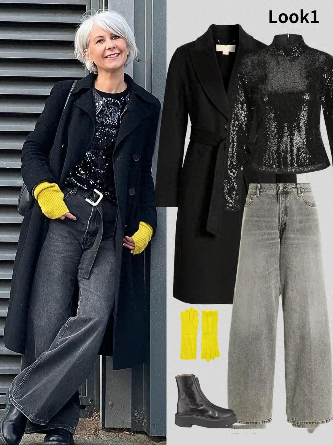 經典的黑色大衣,格外基礎常規的款式,自然是與高腰的闊腿褲更配呀。一條黑灰色的闊腿牛仔褲,搭配亮面的打底衫,將時髦與帥氣完美演繹,尤其是黃色半指手套、也成爲整體穿搭的點睛之筆。